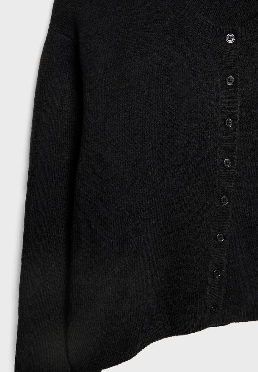 Cardigan en maille au toucher doux à col rond et manches longues. Fermeture sur le devant avec boutons assortis. Disponible en plusieurs couleurs.