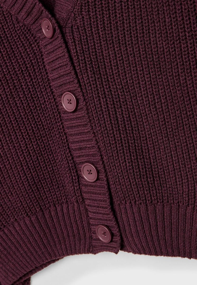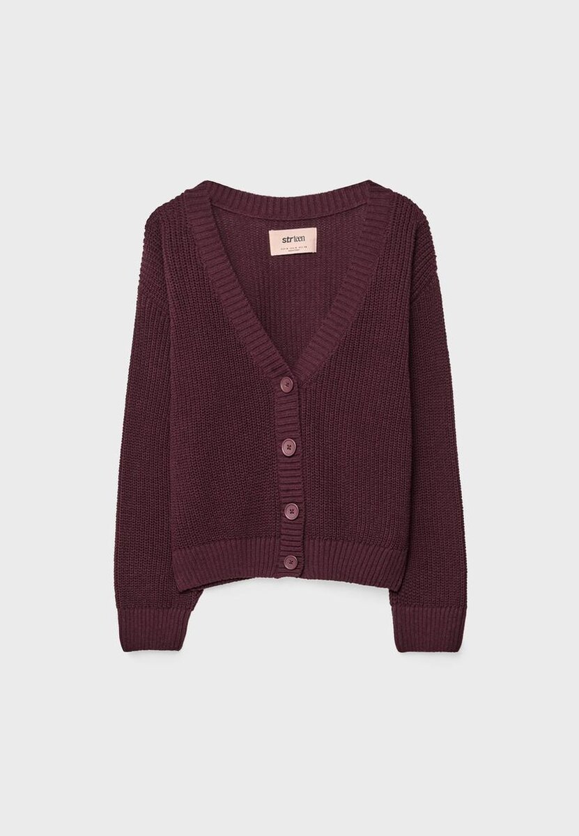 Cardigan en maille à col en V, manches longues, bords-côtes et fermeture à boutons assortis sur le devant. Disponible en plusieurs couleurs.