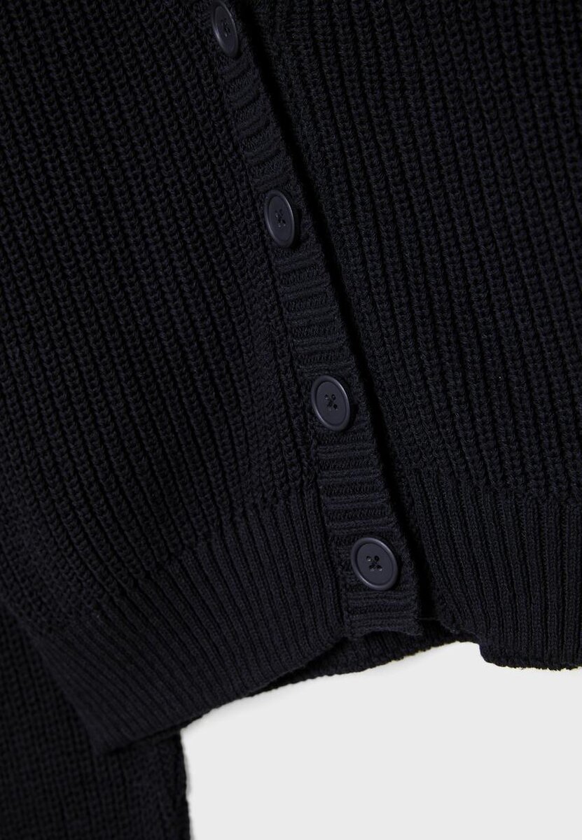 Cardigan en maille à col en V, manches longues, bords-côtes et fermeture à boutons assortis sur le devant. Disponible en plusieurs couleurs.