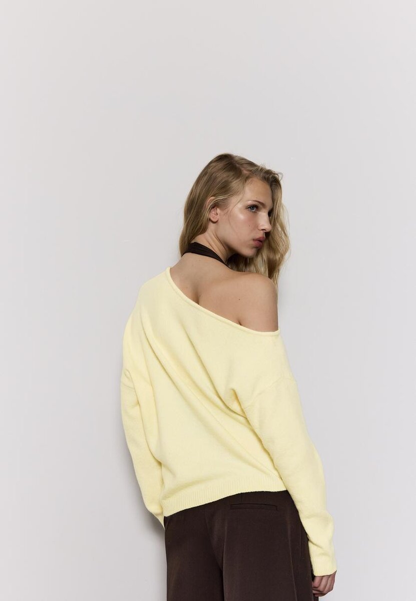 Pull en maille à col bateau et manches longues. Ourlet asymétrique. Bordures côtelées. Disponible en plusieurs couleurs.