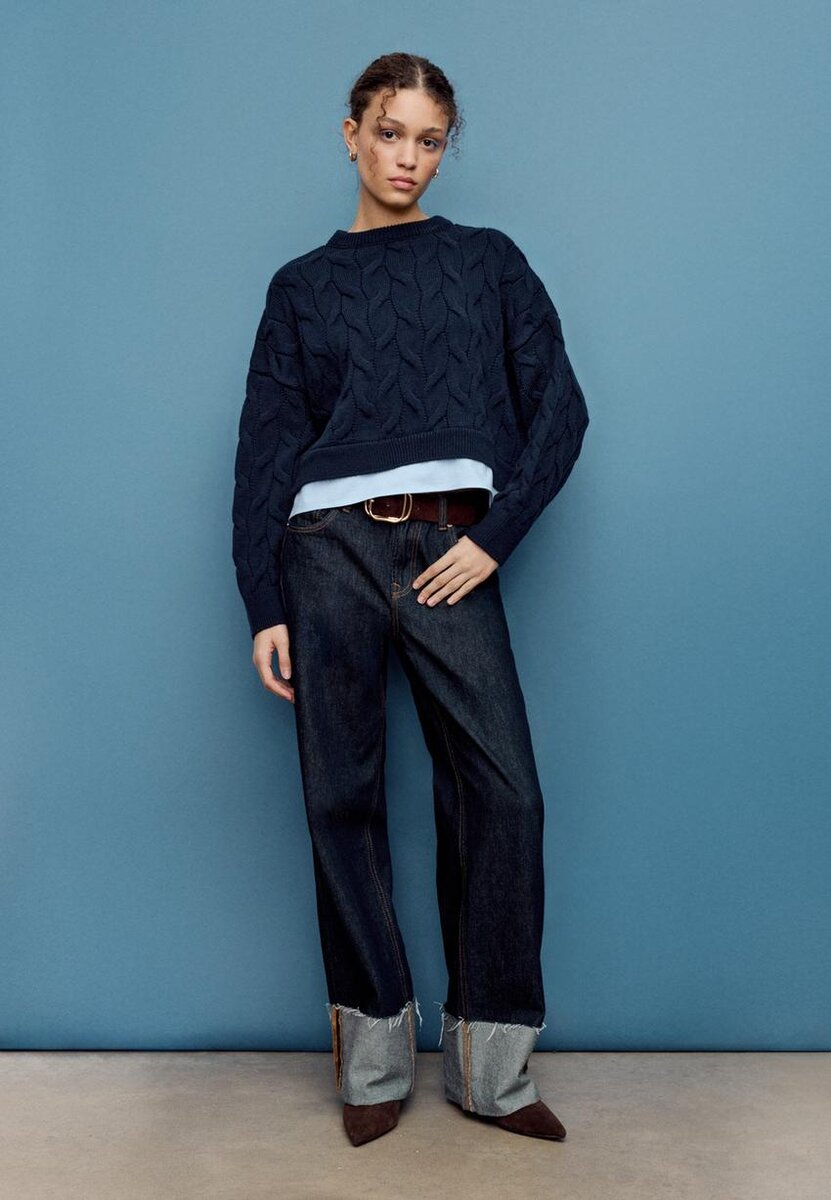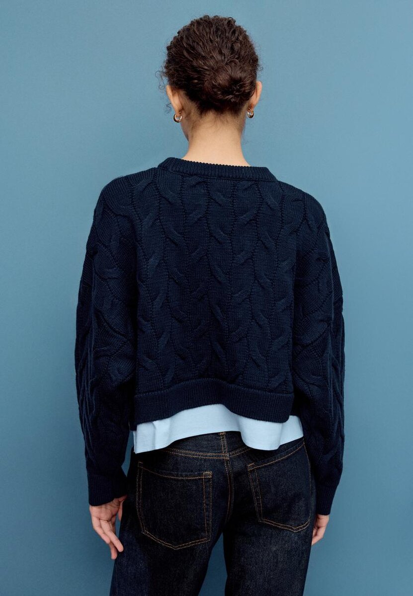 Pull à col rond en maille torsadée avec col à revers contrasté amovible. Il présente des manches longues et un ourlet en tissu combiné avec un effet de superposition double épaisseur. Disponible en plusieurs couleurs.