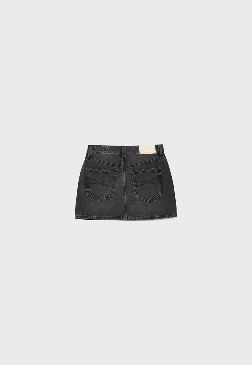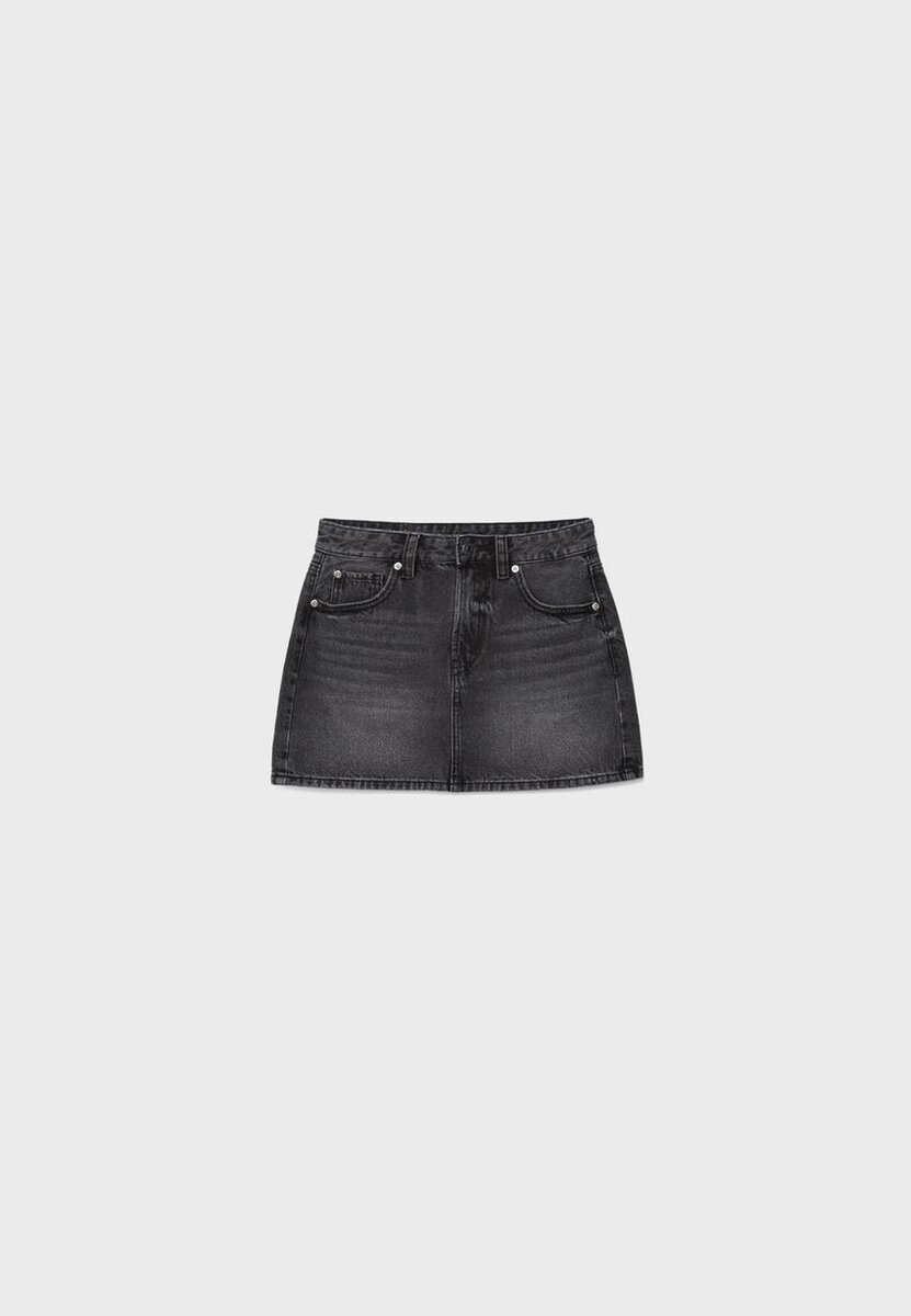Mini-jupe en jean taille mi-haute. Avec cinq poches et passants de ceinture. Fermeture à glissière et boutons sur le devant. Disponible en plusieurs couleurs.