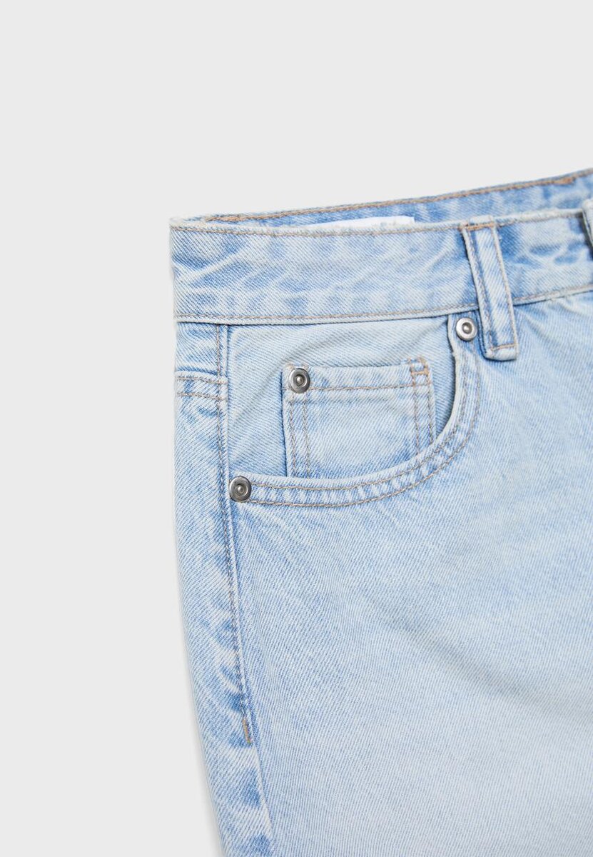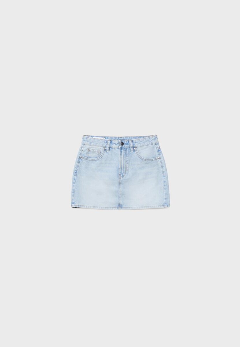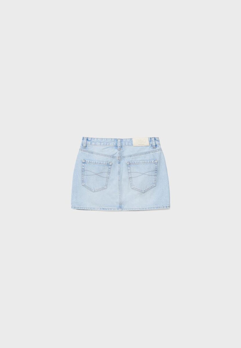 Mini-jupe en denim à taille mi-haute. Avec cinq poches et passants de ceinture. Fermeture à glissière et boutons sur le devant. Disponible en plusieurs couleurs.