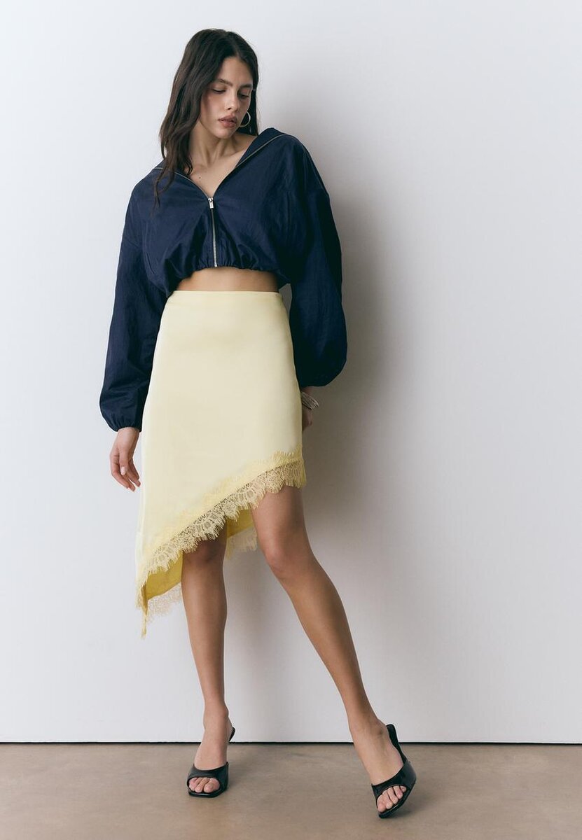 Jupe midi à taille mi-haute en tissu effet satin. Ourlet asymétrique avec bordure en dentelle. Disponible en plusieurs couleurs.