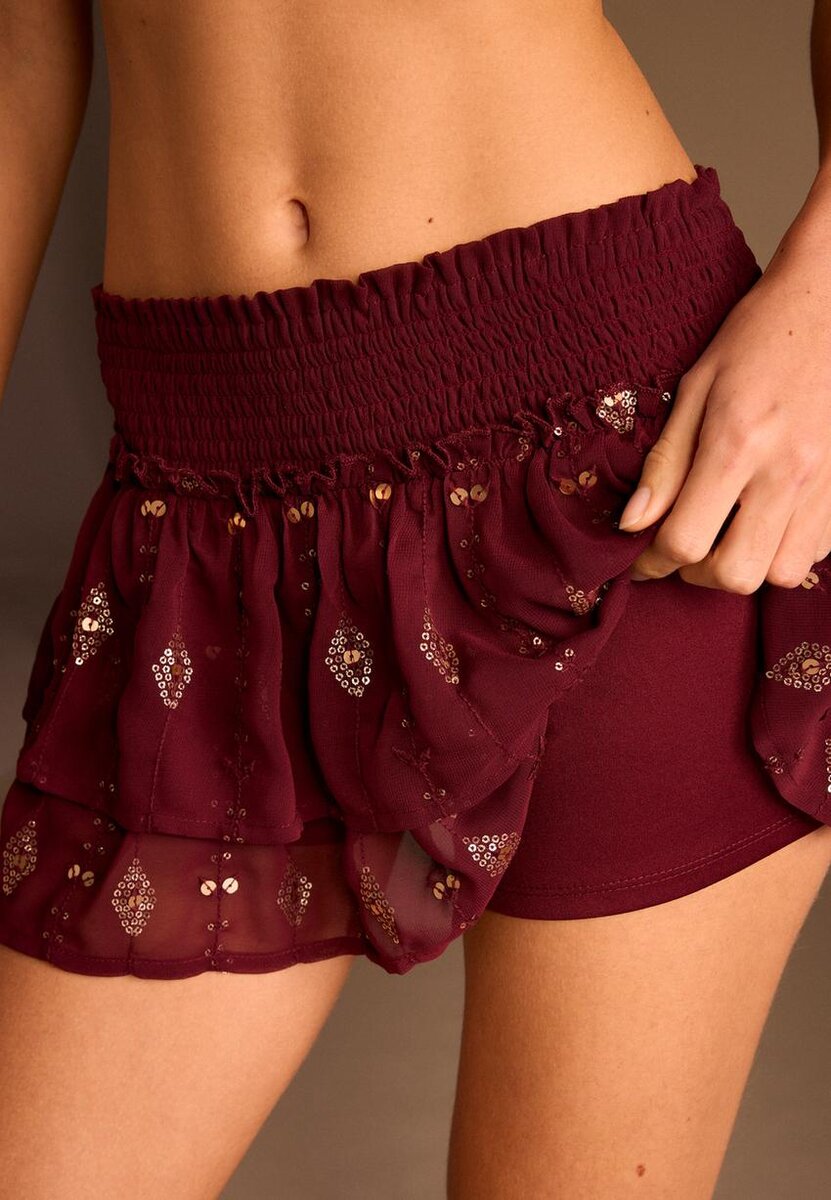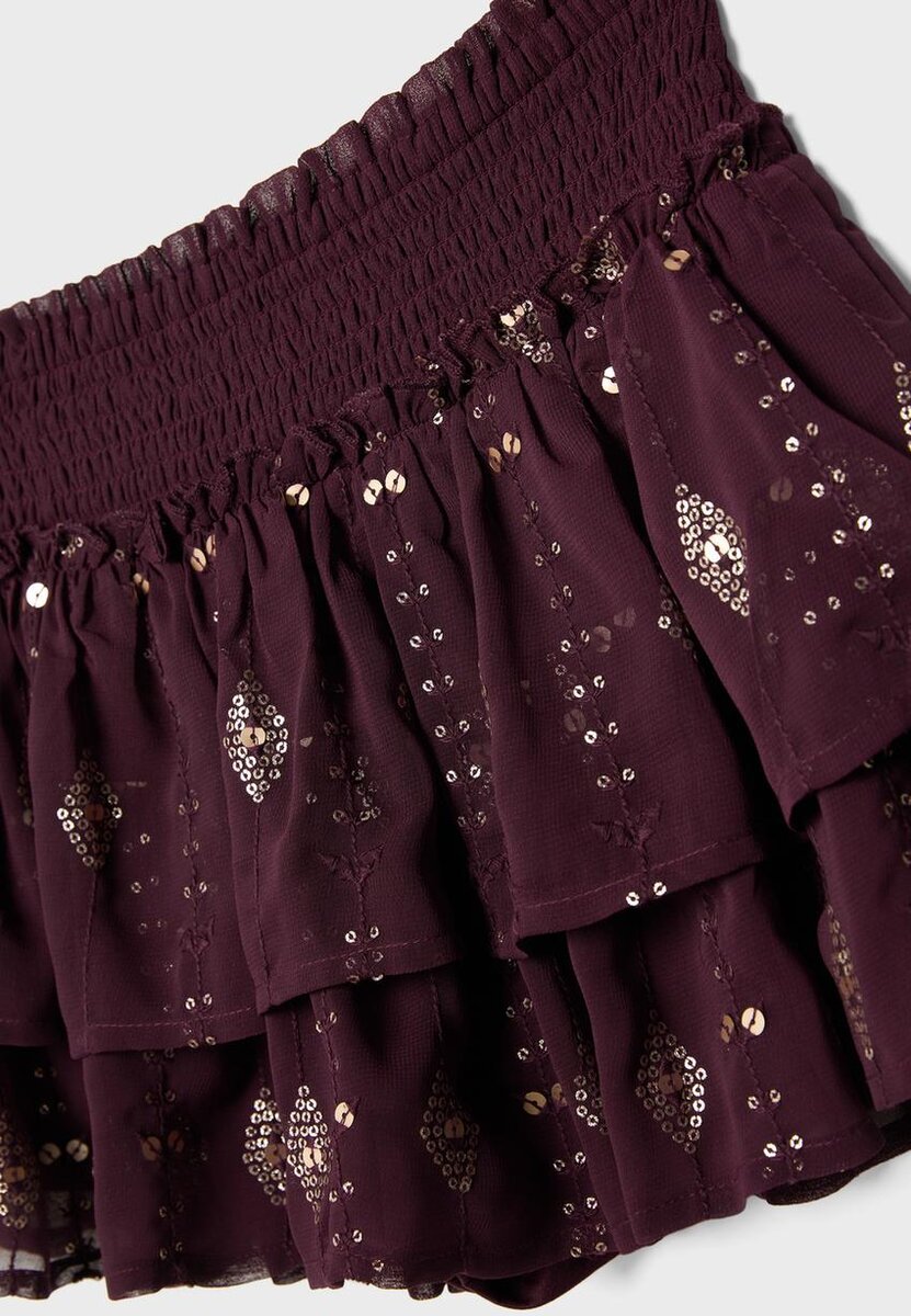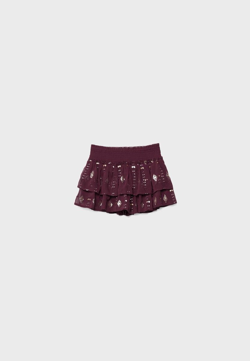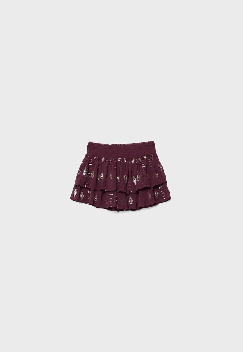 Jupe fluide à taille mi-haute avec une ceinture élastiquée à volants. Ornée de détails brodés.