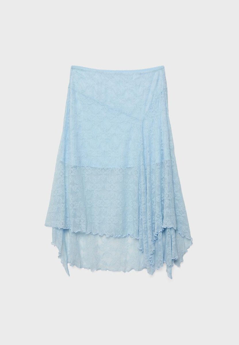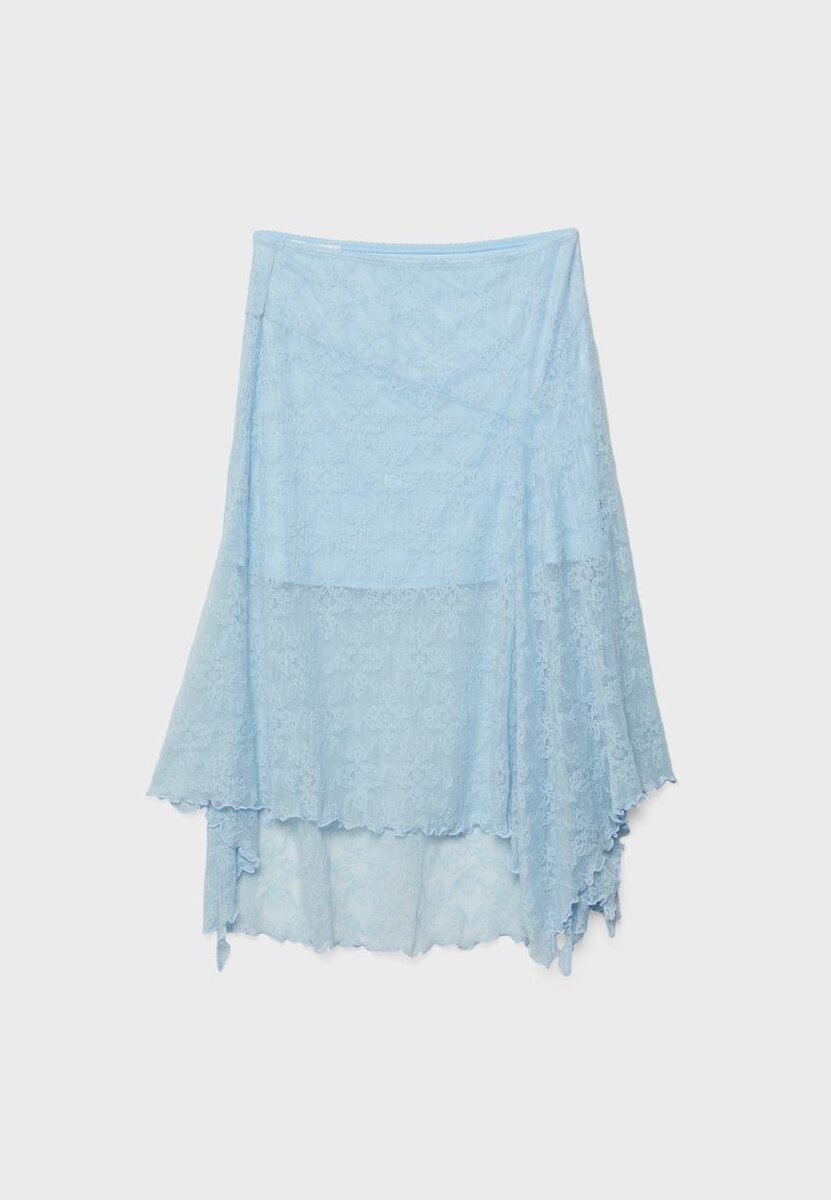 Jupe midi fluide en dentelle avec une doublure intérieure assortie. Taille mi-haute avec une ceinture élastiquée et un ourlet asymétrique.