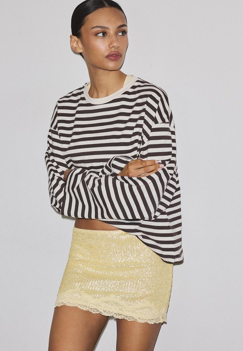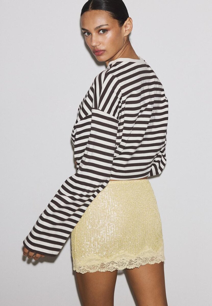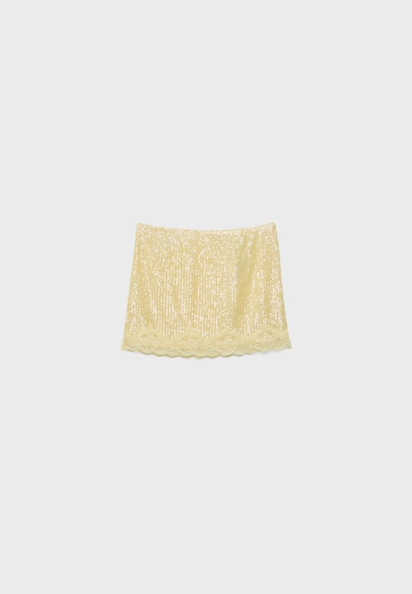 Mini-jupe droite confectionnée dans un tissu orné de paillettes. Taille haute et ceinture élastiquée. Doublure ton sur ton et ourlet orné d’une délicate bordure en dentelle.