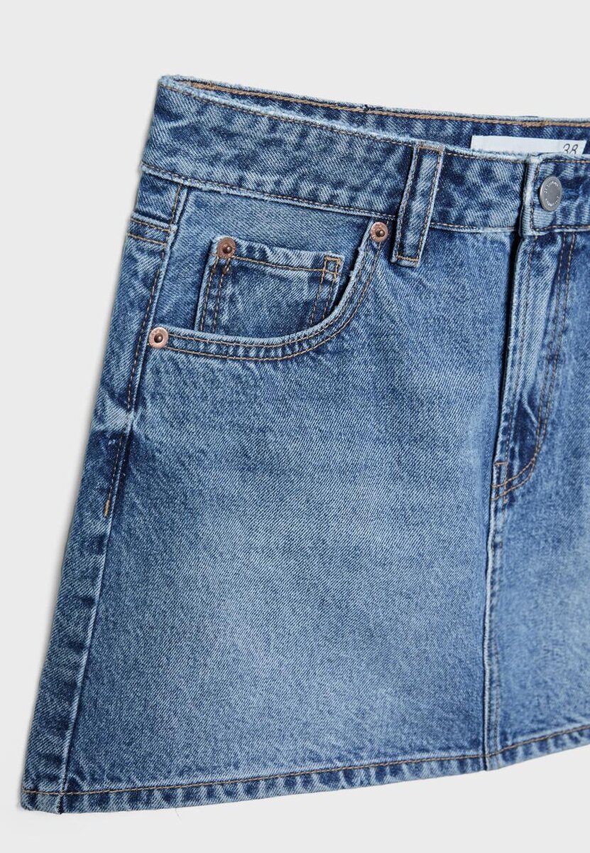 Mini-jupe en denim à taille mi-haute avec passants de ceinture. Poches avant et poches plaquées à l’arrière. Braguette à fermeture éclair sur le devant et boutons métalliques. Disponible en plusieurs couleurs.