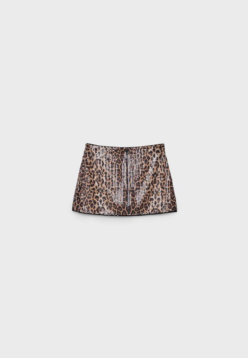 Mini-Skort taille moyenne avec ceinture élastiquée. Tissu imprimé avec application de paillettes. Doublure intérieure. Ourlet fini avec une bordure contrastée.