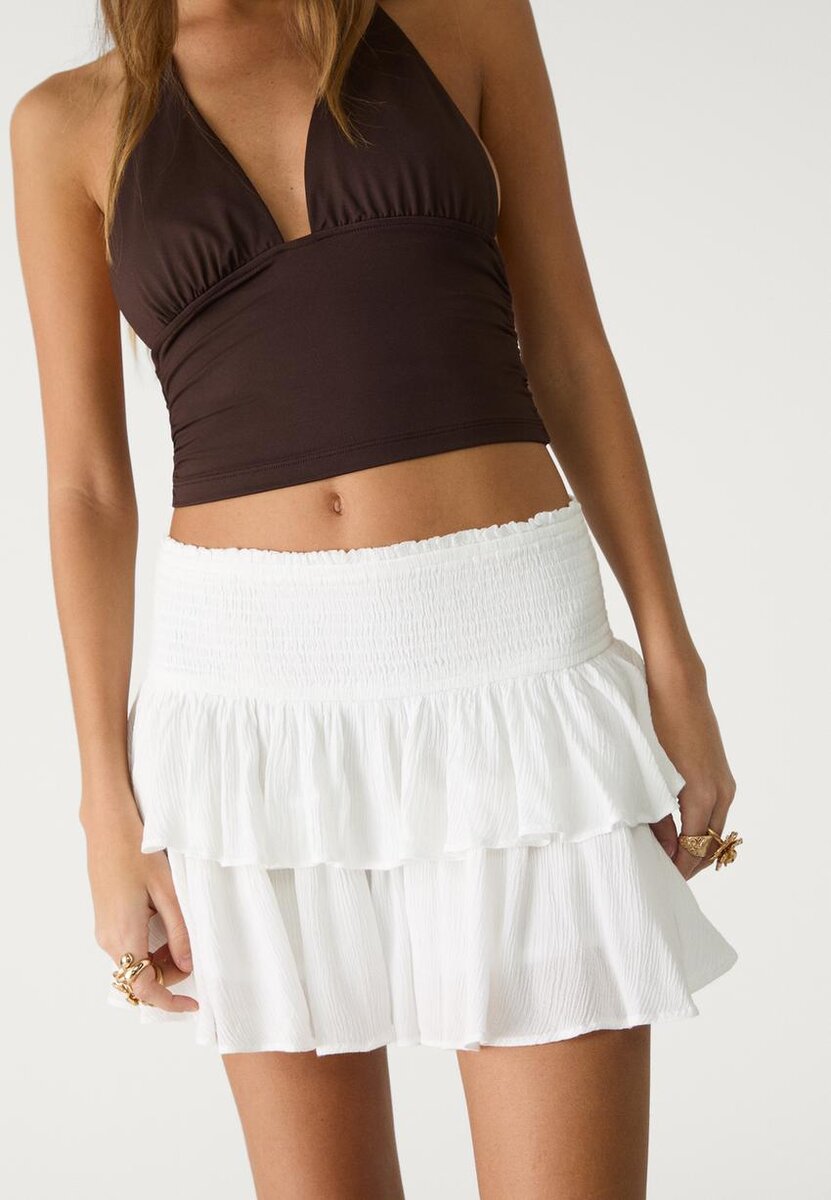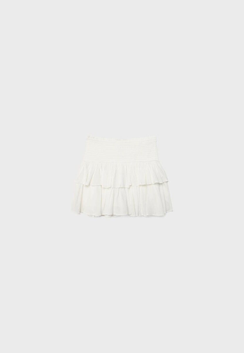 Skort fluide à taille mi-haute avec une ceinture smockée élastiquée. Ourlet fluide à volants. Disponible en plusieurs couleurs.