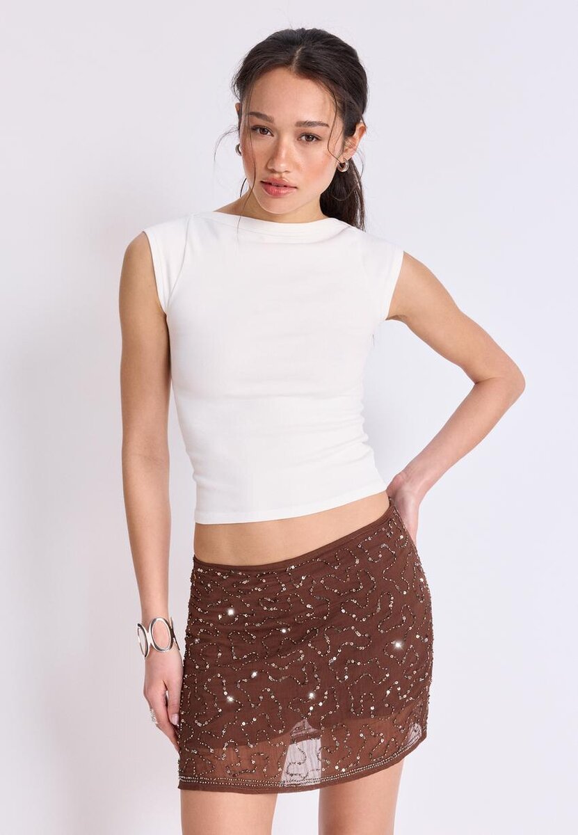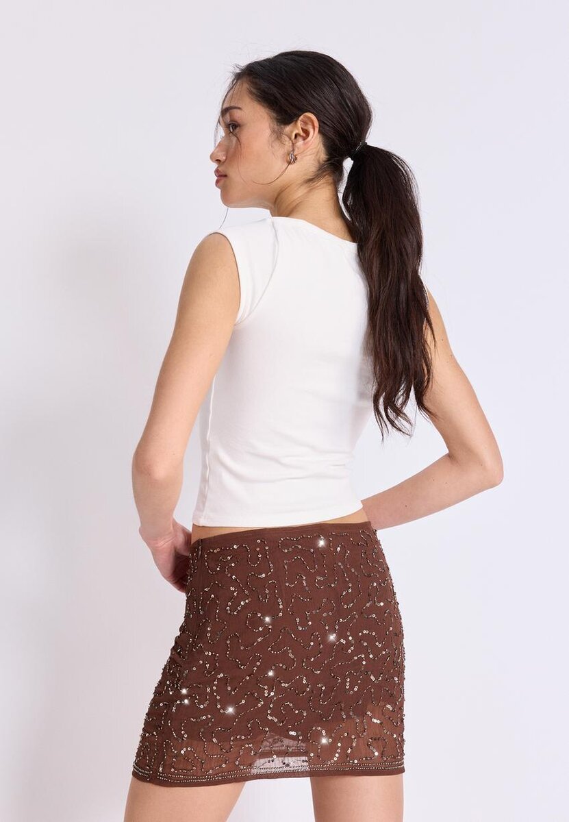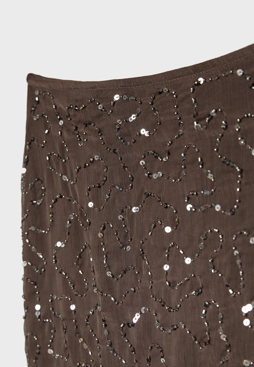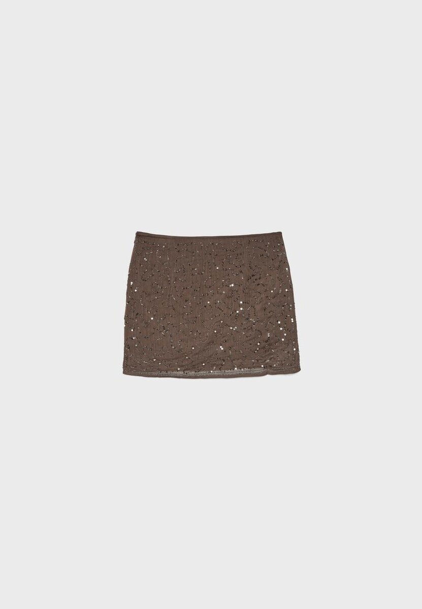 Mini-Skort confectionnée dans un tissu semi-transparent avec des broderies de paillettes et de perles. Taille mi-haute. Doublure assortie de style Shorts. Ourlet droit.