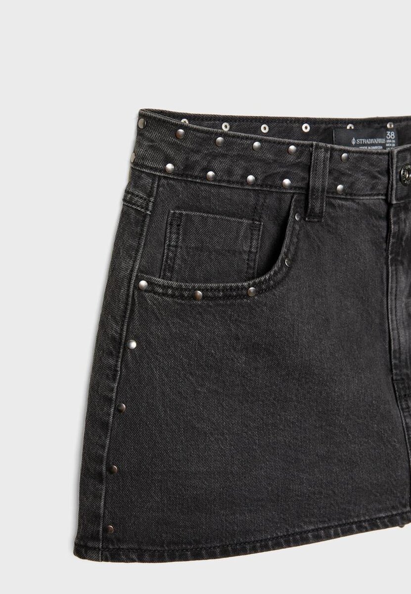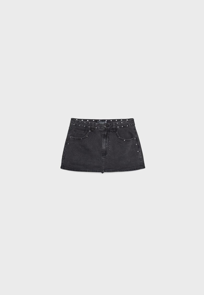Mini-skort en denim taille mi-haute avec passants de ceinture. Dotée de poches avant, de poches plaquées arrière, d’appliqués cloutés en métal et d’une fermeture à glissière avant et à boutons métalliques.