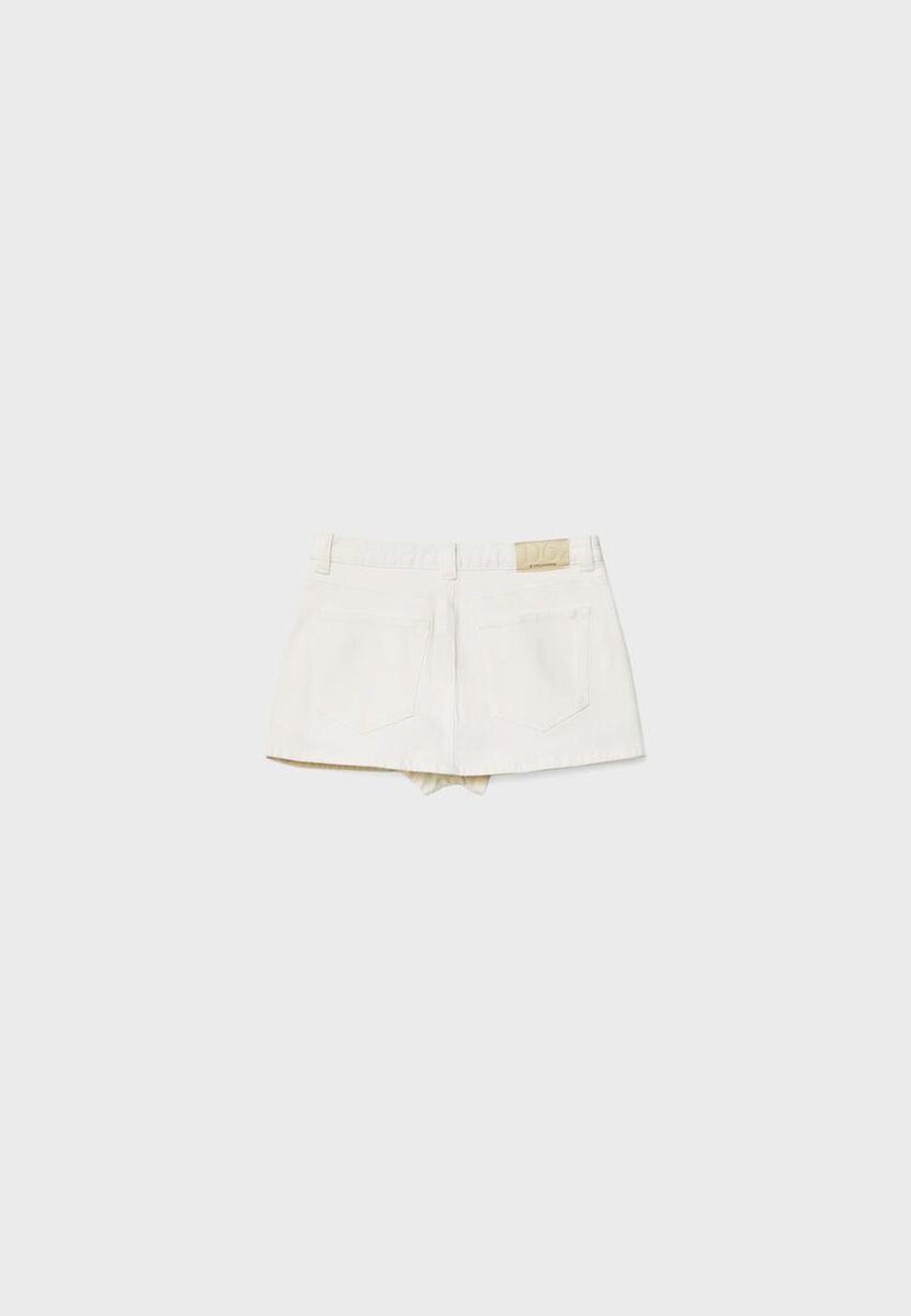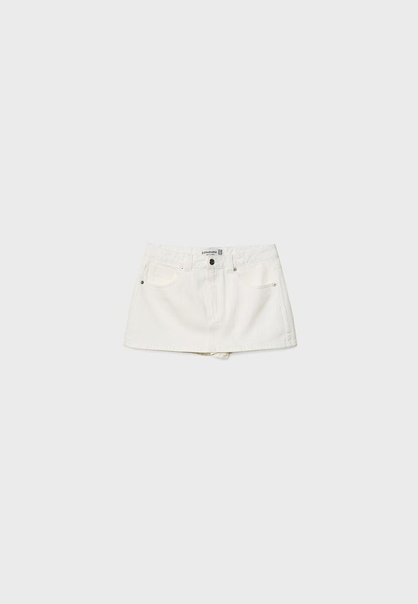 Skort en denim taille moyenne avec passants de ceinture. Poches avant et poches plaquées à l’arrière.