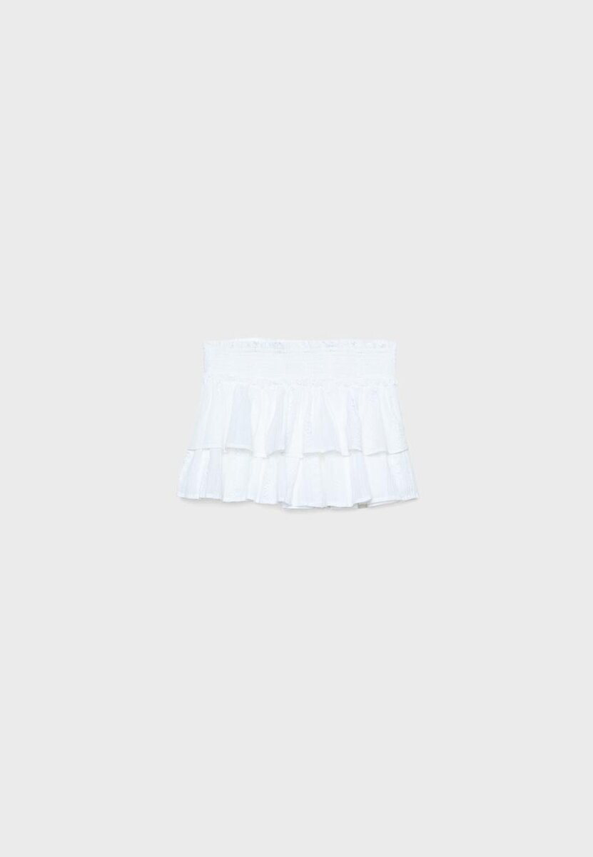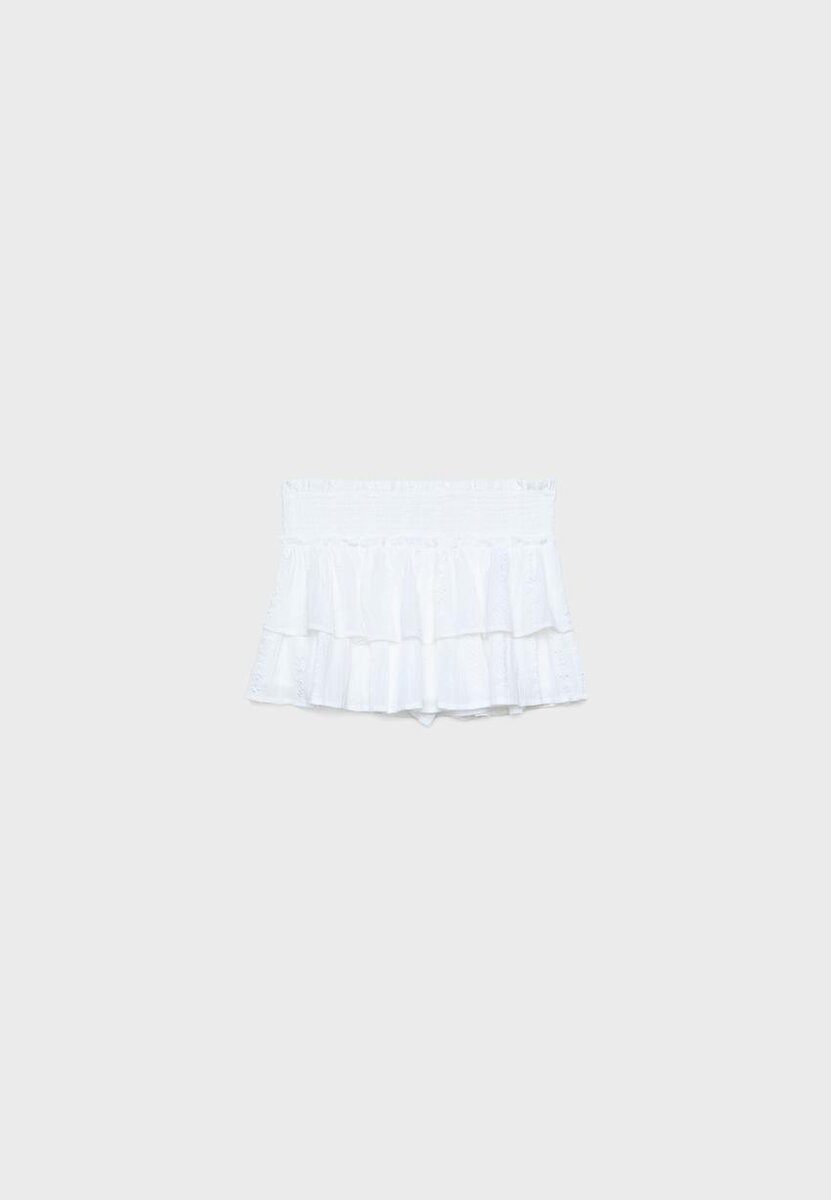 Skort fluide à taille mi-haute avec une ceinture smockée élastiquée. Détail en tissu brodé assorti. Ourlet fluide à volants. Disponible en plusieurs couleurs.