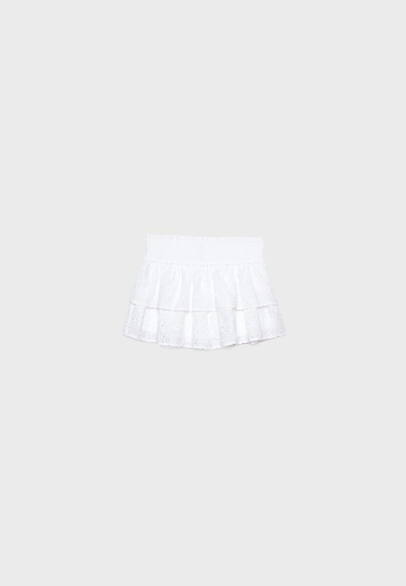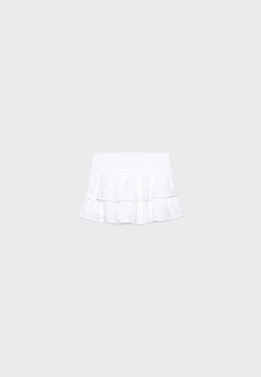 Skort à taille mi-haute avec ceinture élastiquée. Dotée d’un ourlet fluide avec broderies ajourées assorties et d’une doublure de style Shorts. Disponible en plusieurs couleurs.