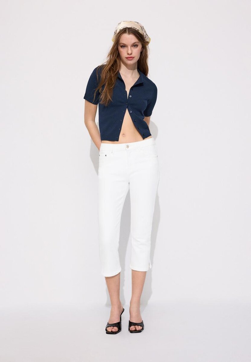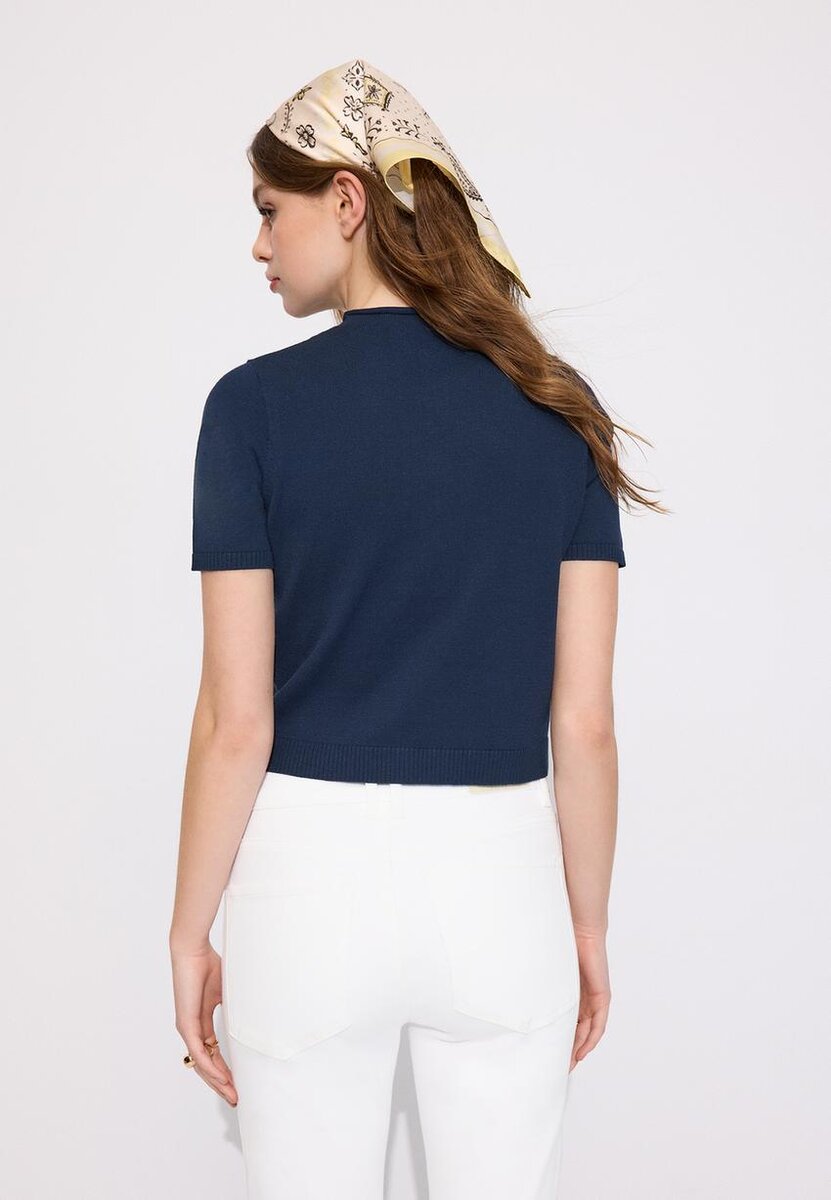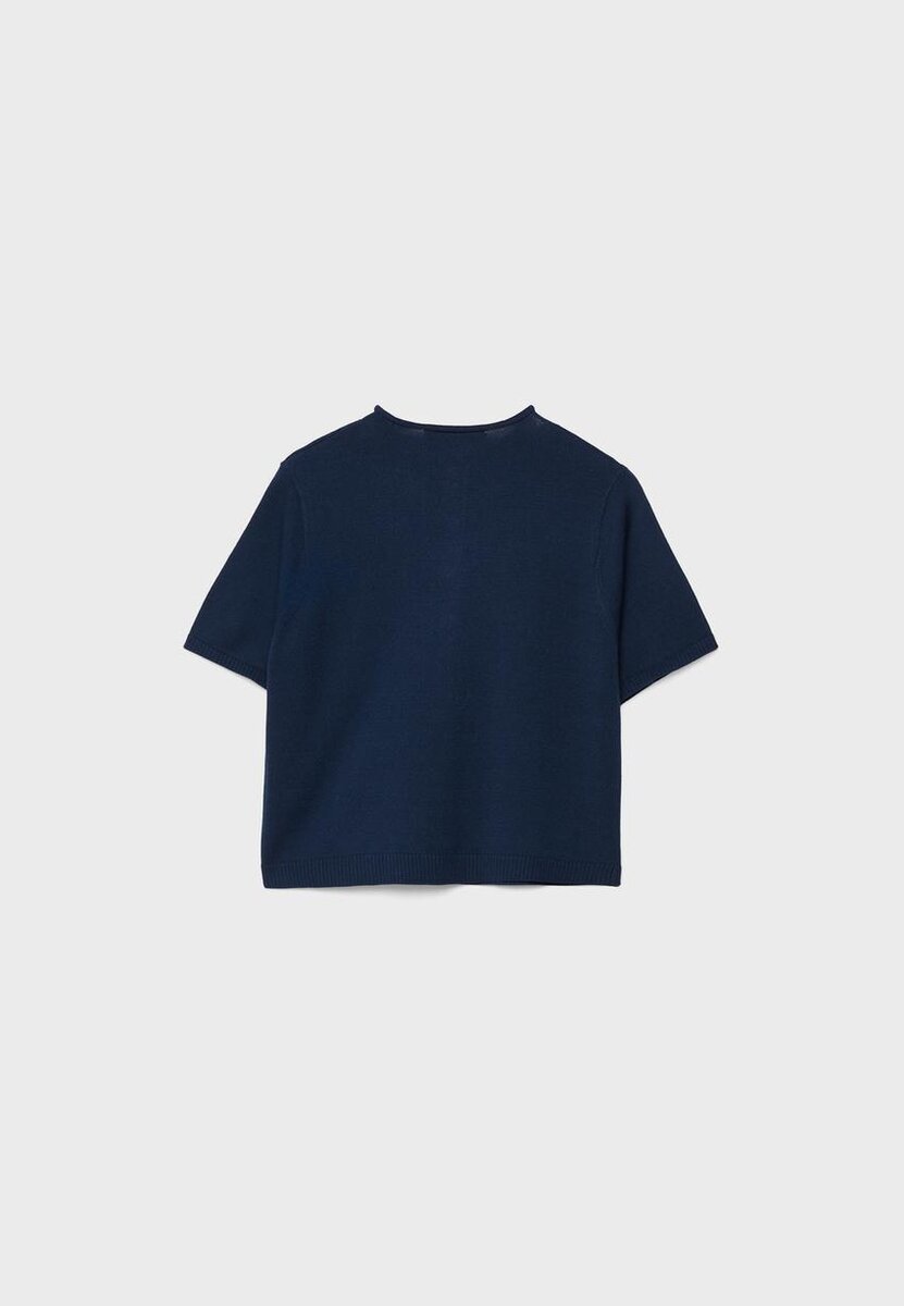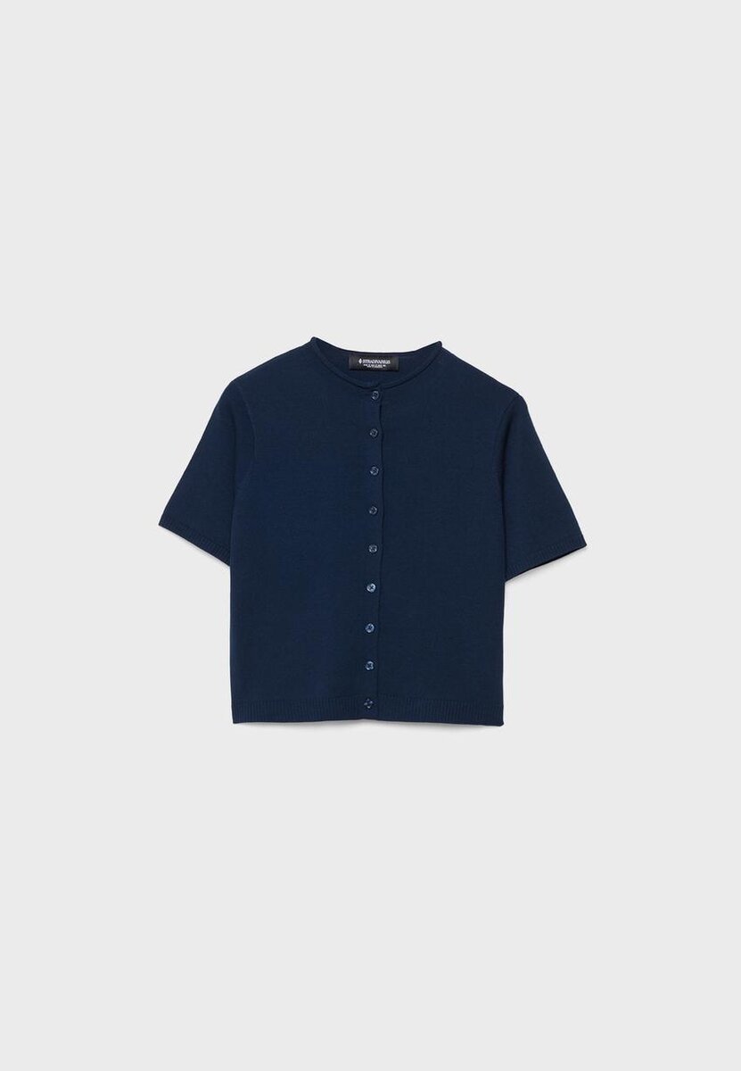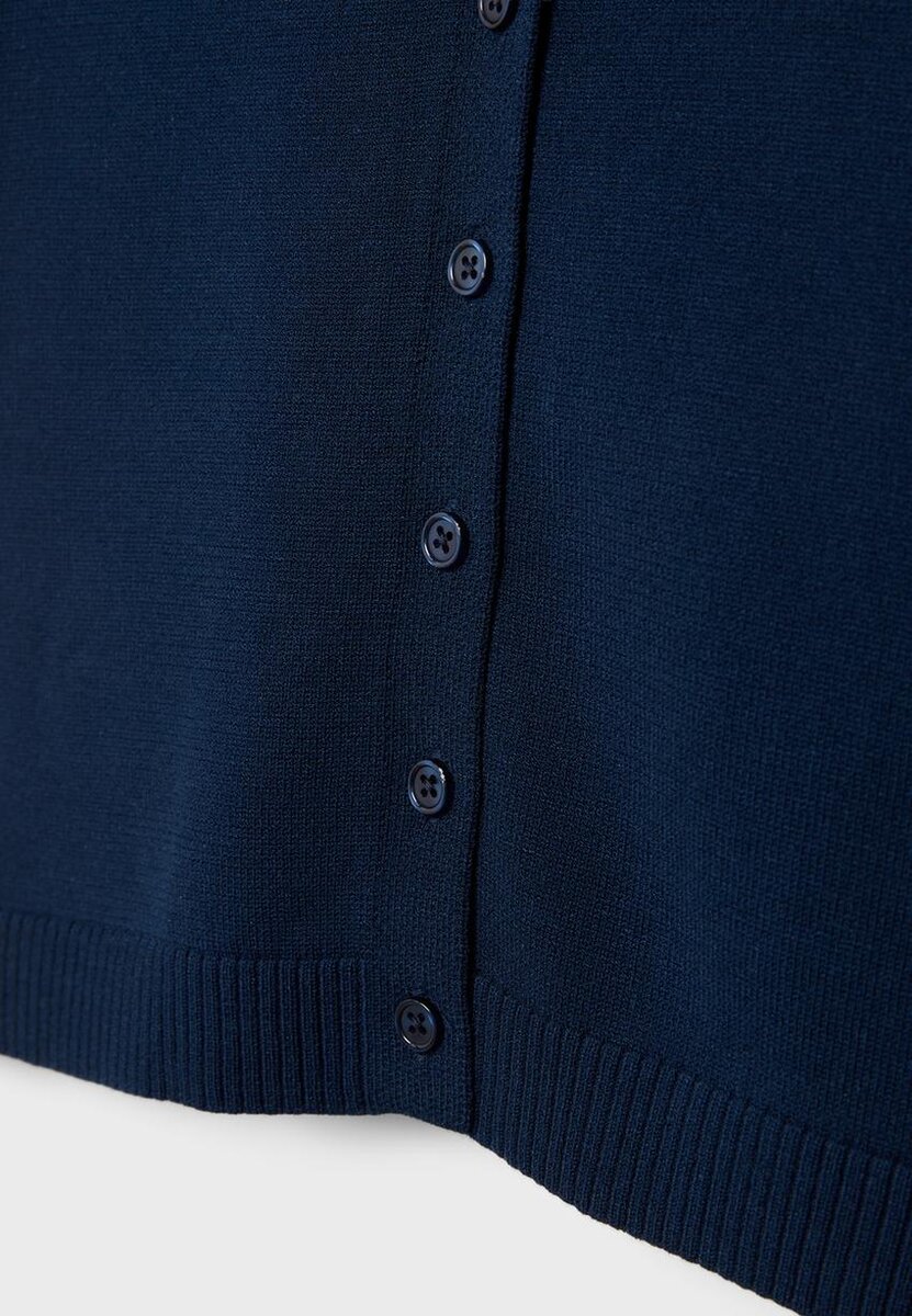 Cardigan en maille à col montant et manches courtes. Fermeture à l’avant avec boutons assortis. Bordures côtelées aux manches et à l’ourlet.