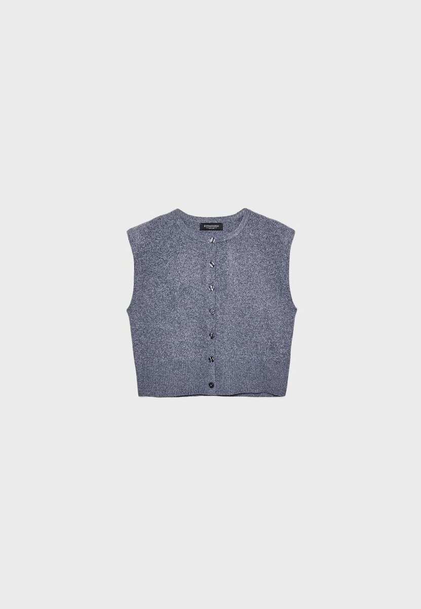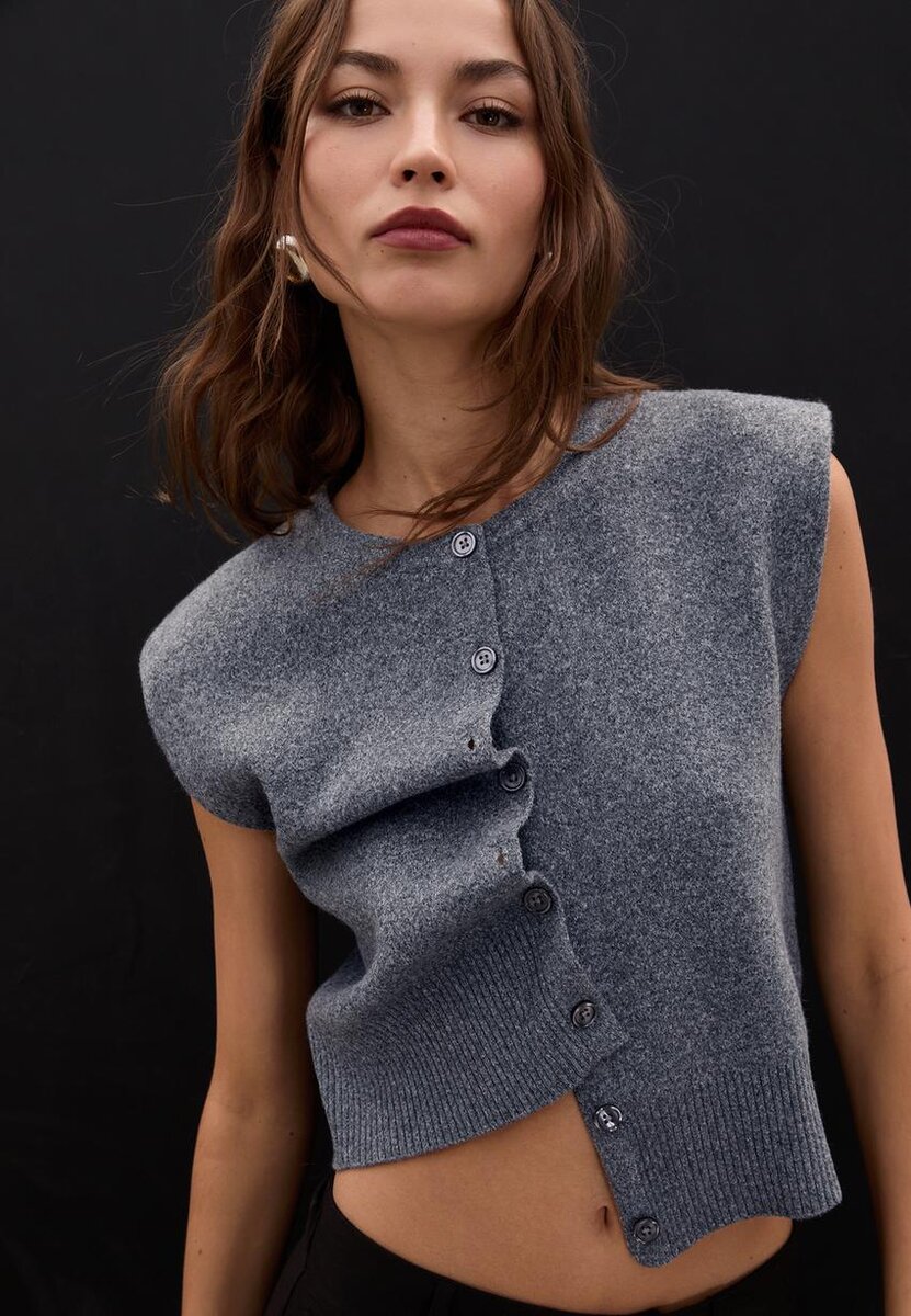 Gilet en maille unie à col rond et épaules rembourrées. Ourlet côtelé. Fermeture à boutons sur le devant.