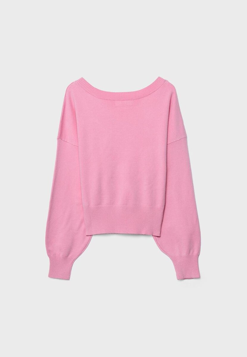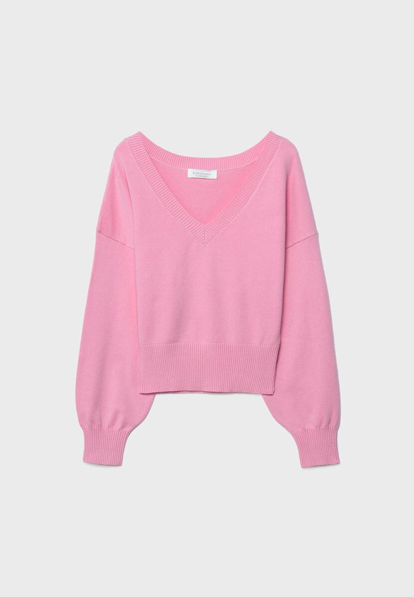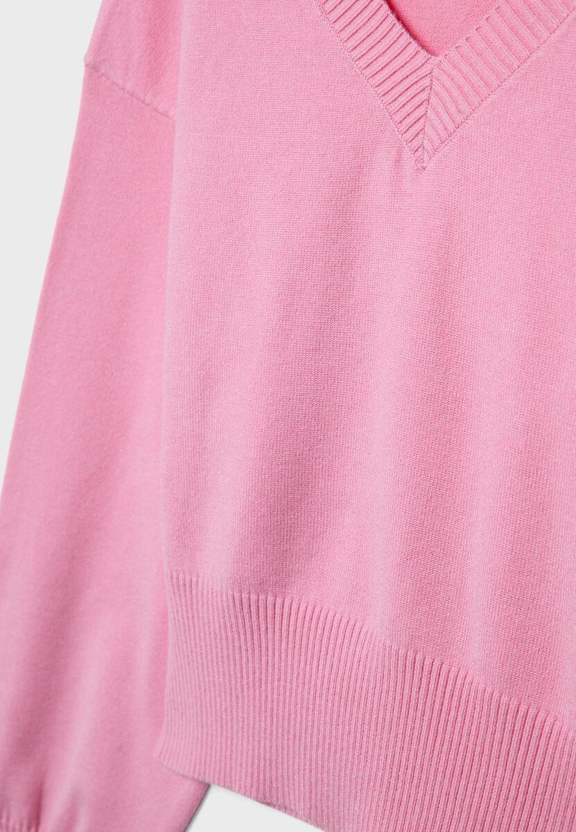 Pull en maille à col en V et manches chauve-souris. Ourlet côtelé. Disponible en plusieurs couleurs.