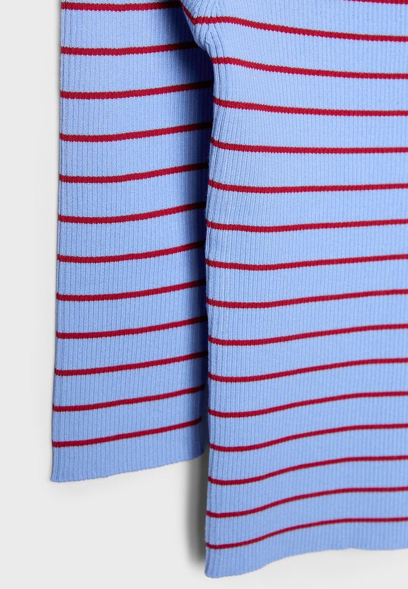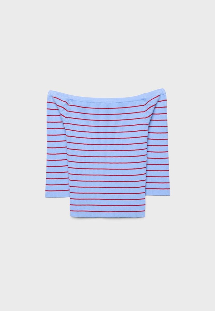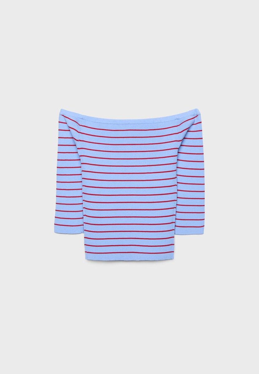 Pull ajusté en maille. Col bateau et manches au coude, épaules dénudées.