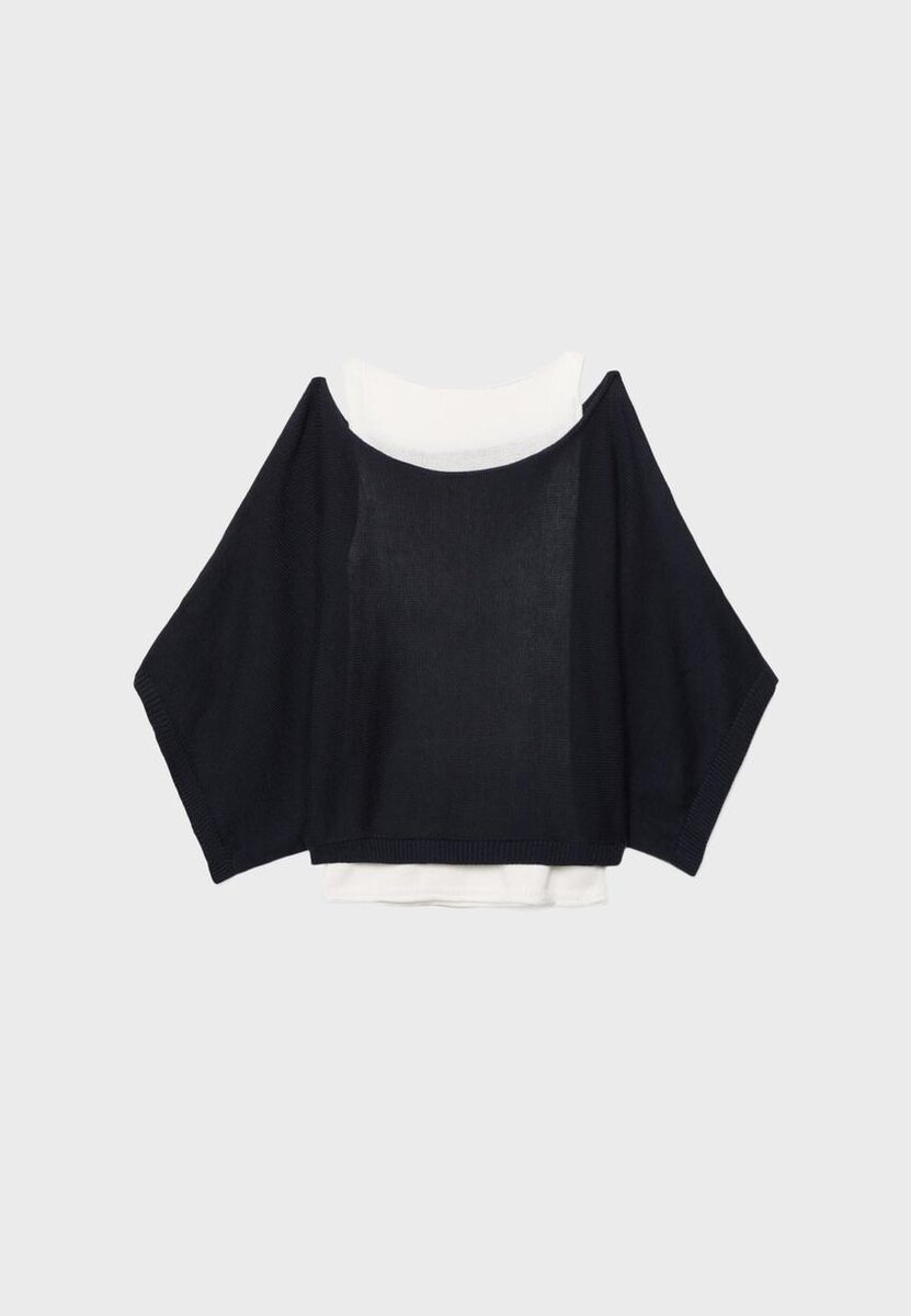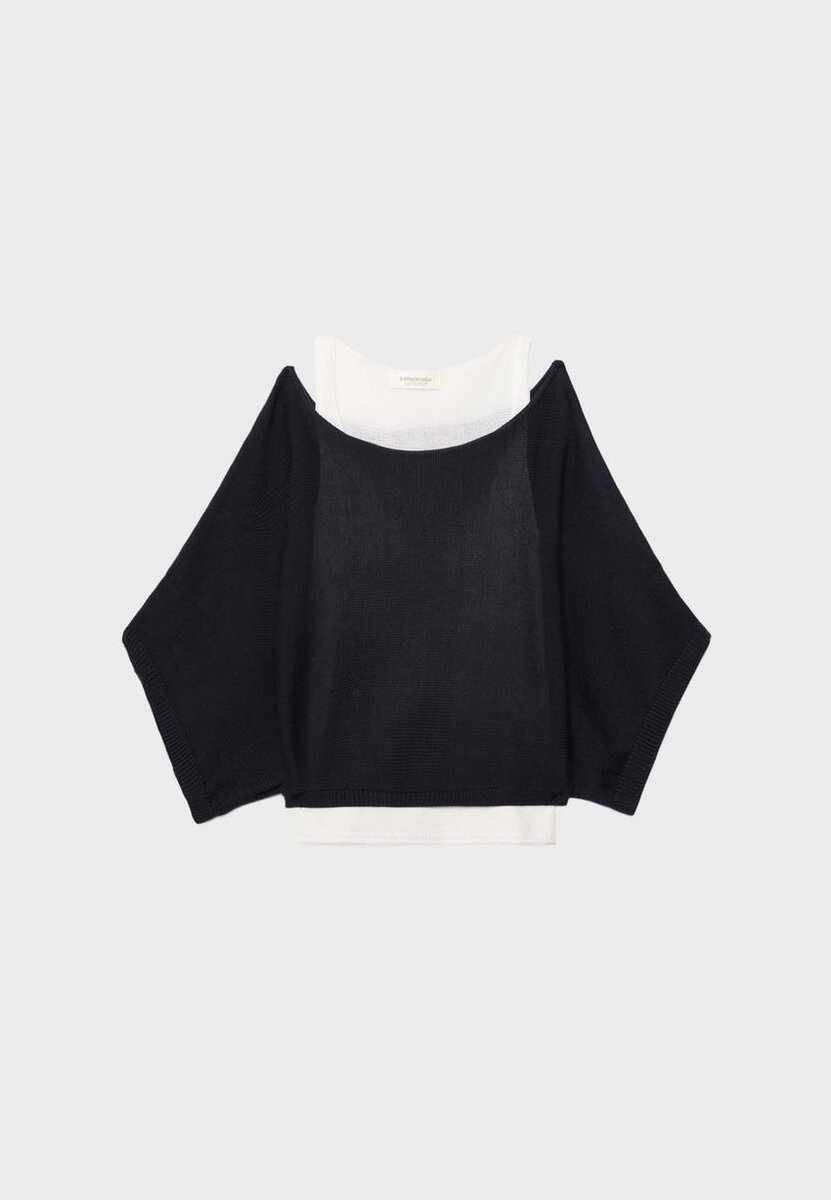 Pull en maille à col bateau et manches larges. Doté d’une superposition en tissu double épaisseur contrasté. Disponible en plusieurs couleurs.
