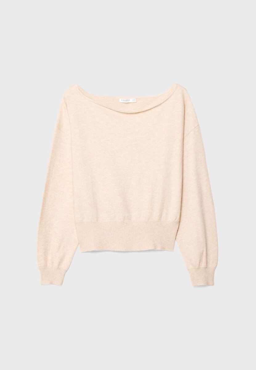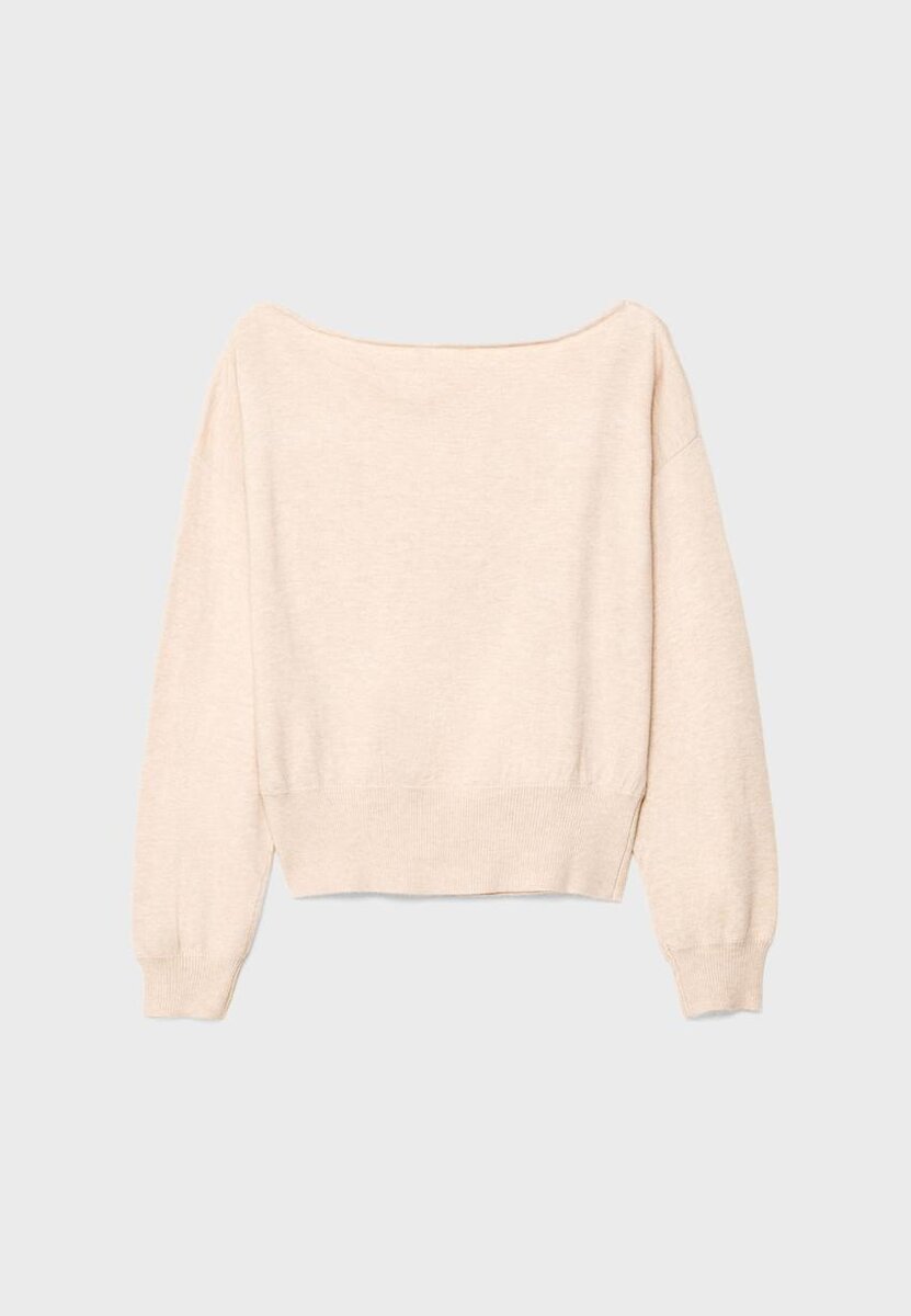 Pull confectionné en maille extensible. Col bateau et manches longues à poignets. Ourlet côtelé. Disponible en plusieurs couleurs.