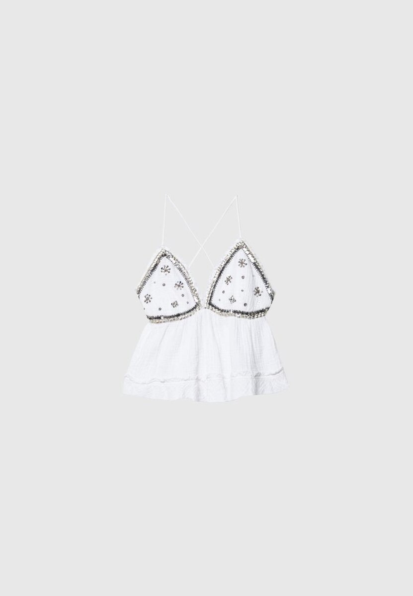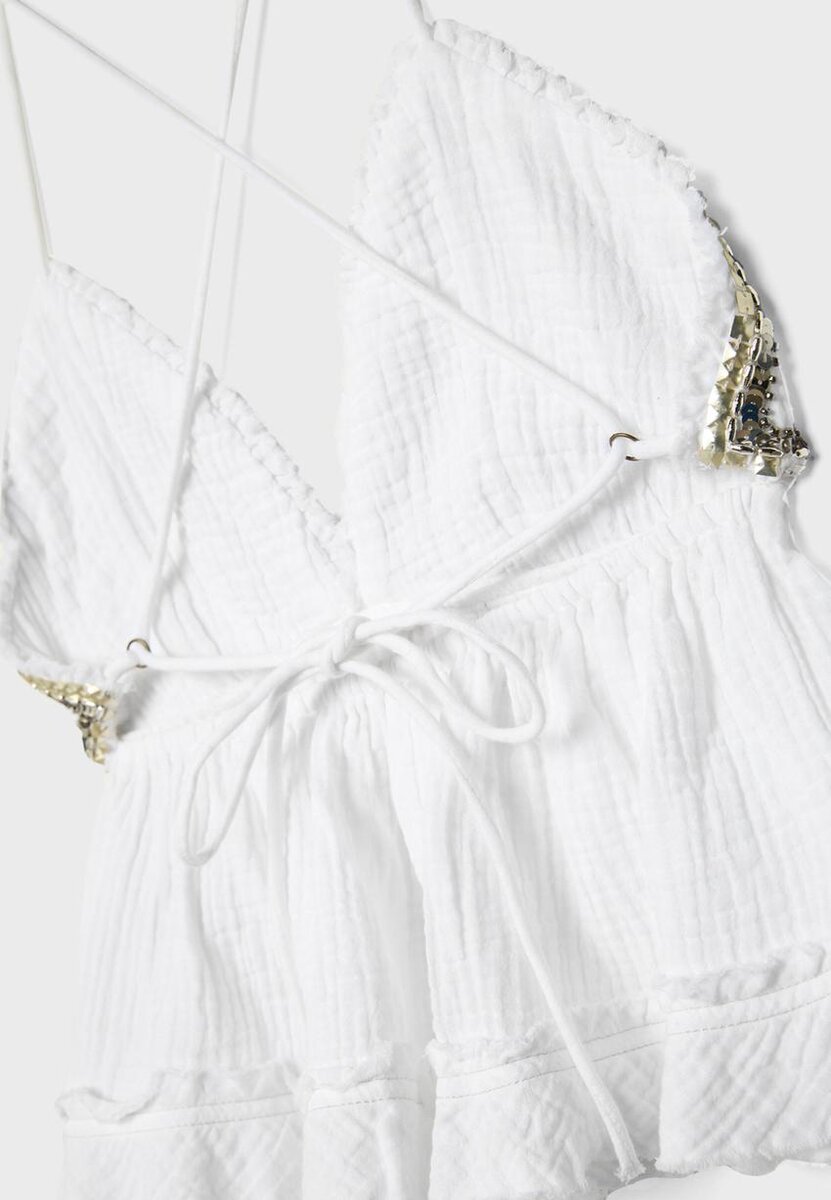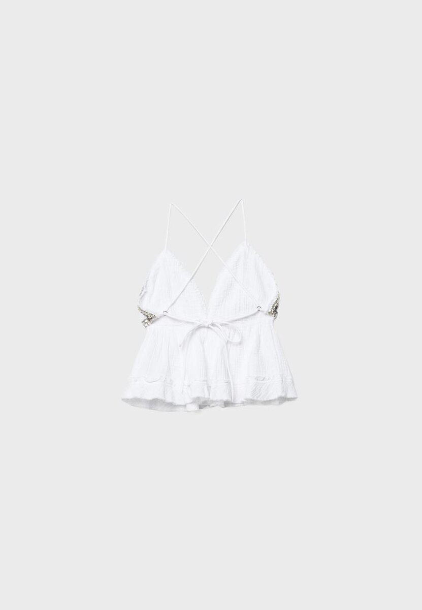 Hauts à col en V avec fines bretelles croisées dans le dos. Ourlet à volants. Orné de perles contrastées.