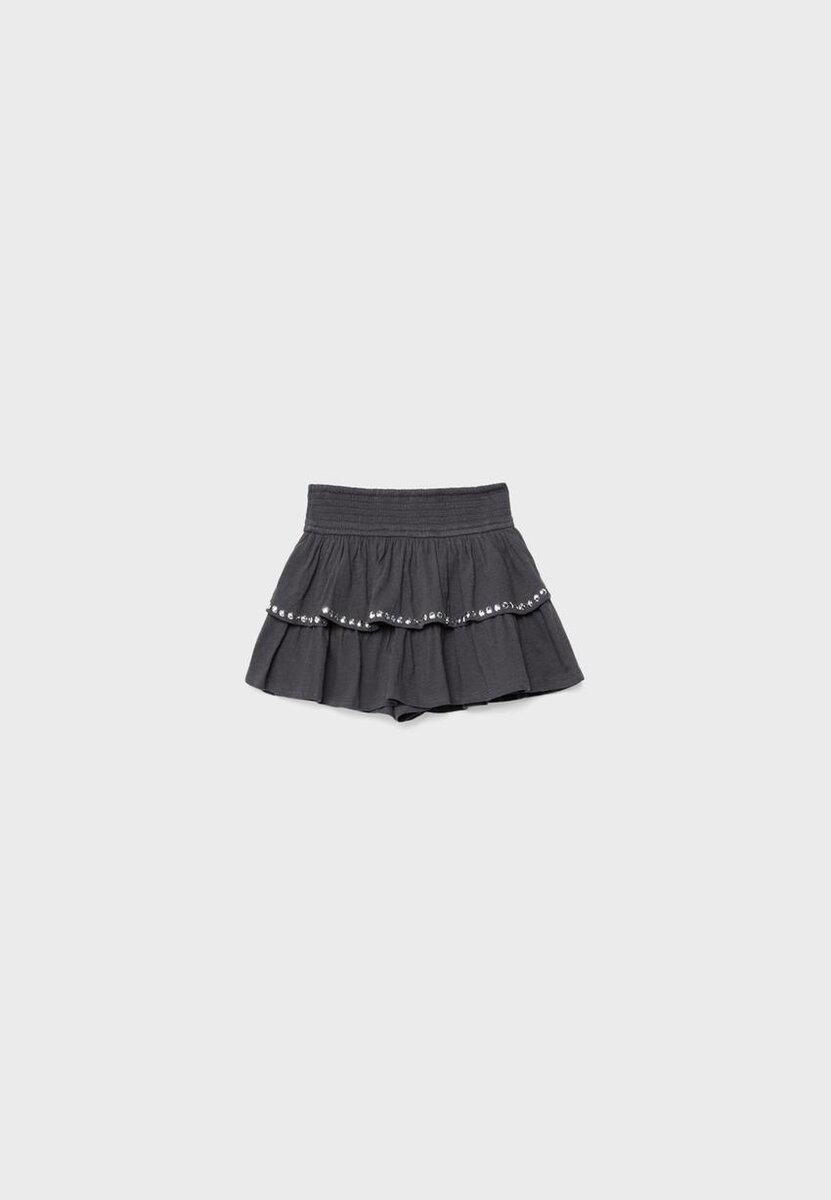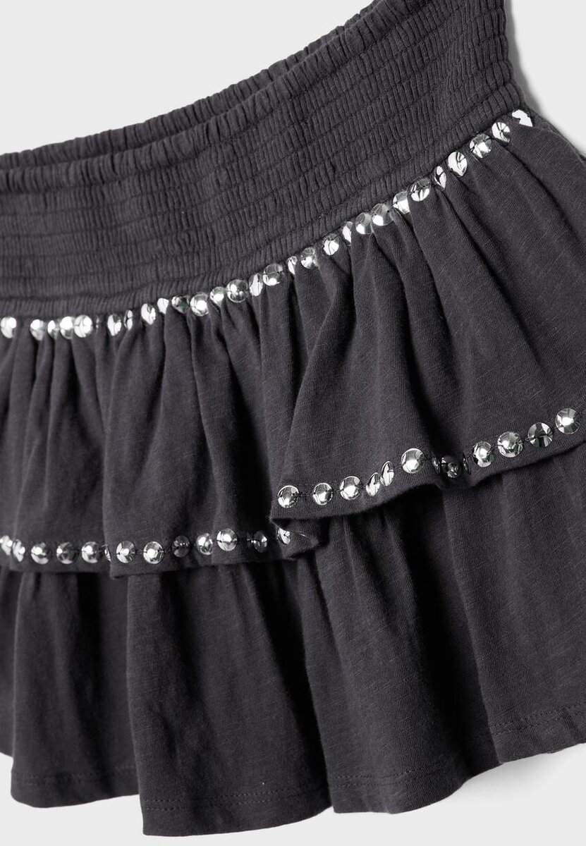 Mini-jupe avec une ceinture smockée élastiquée. Ornée d’un ourlet à volants avec des clous. Shorts assortis intégrés. Disponible en plusieurs couleurs.