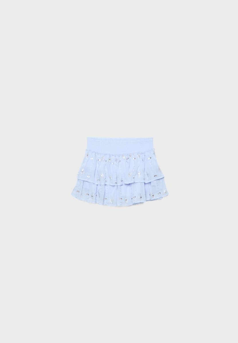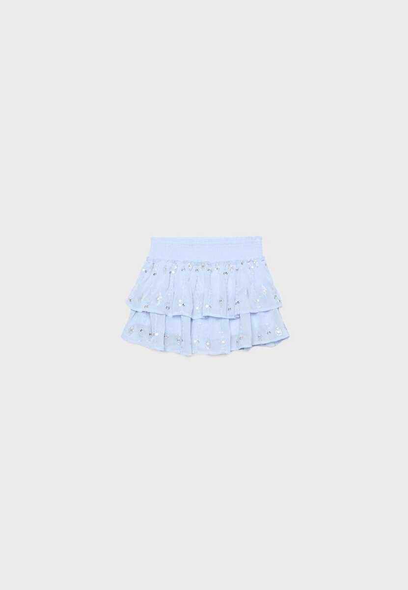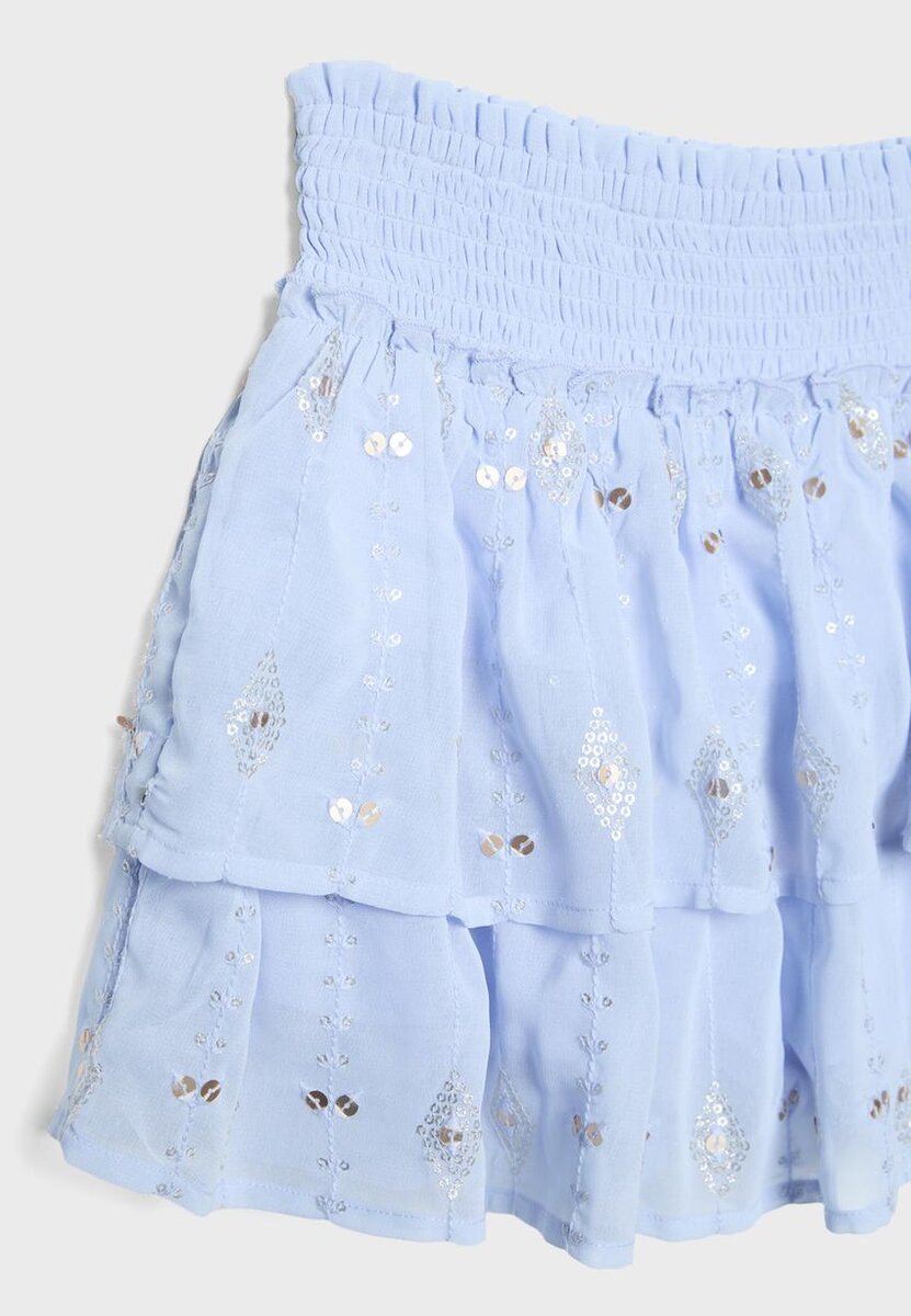 Mini-jupe avec une ceinture smockée élastiquée. Ornée d’un ourlet à volants et de broderies perlées. Disponible dans une gamme de couleurs.
