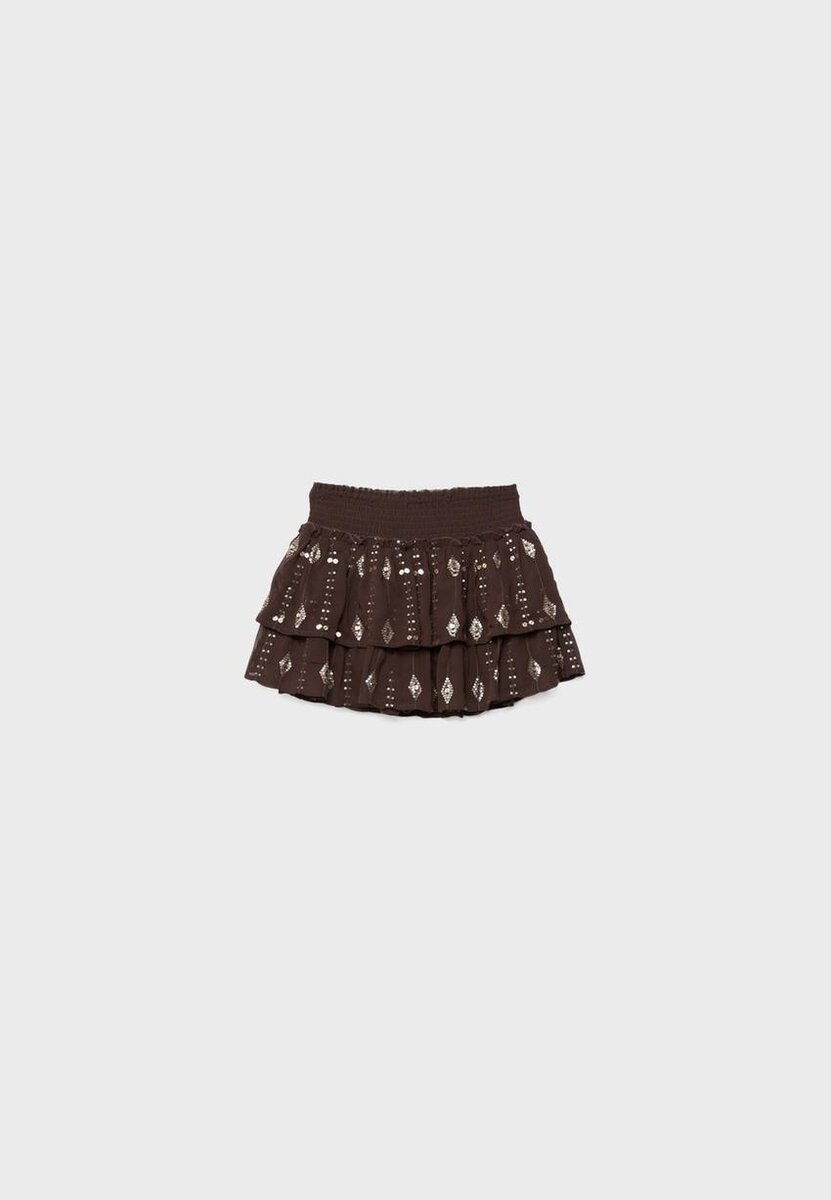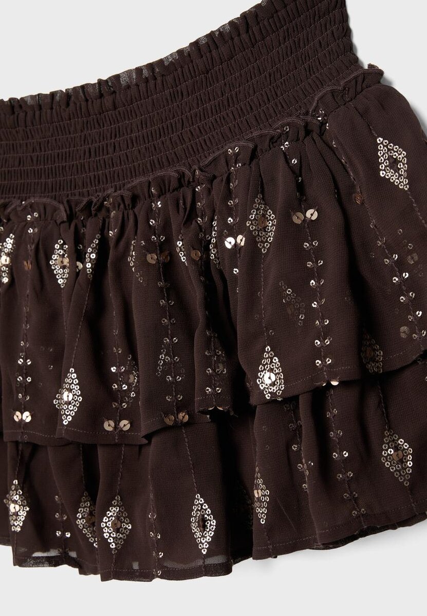 Mini-jupe avec une ceinture élastiquée froncée. Ornée d’un ourlet à volants et de broderies perlées. Disponible en plusieurs couleurs.