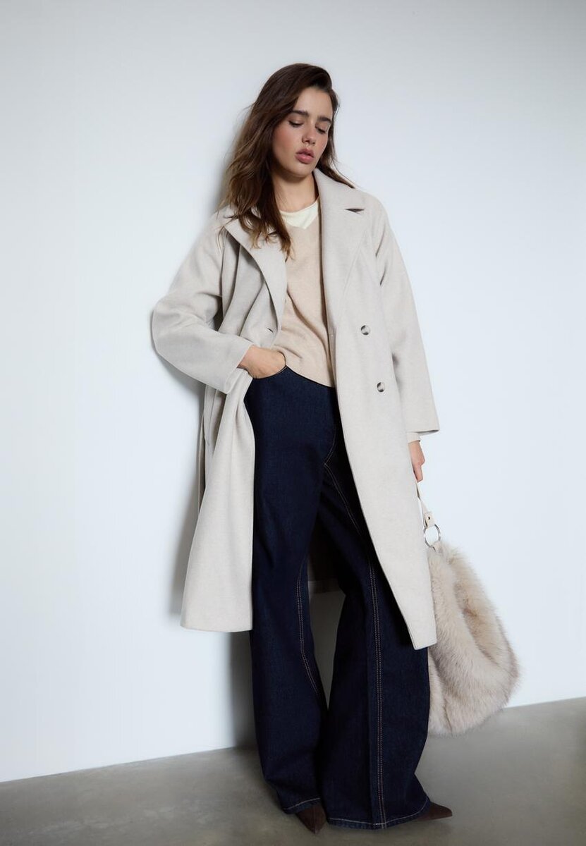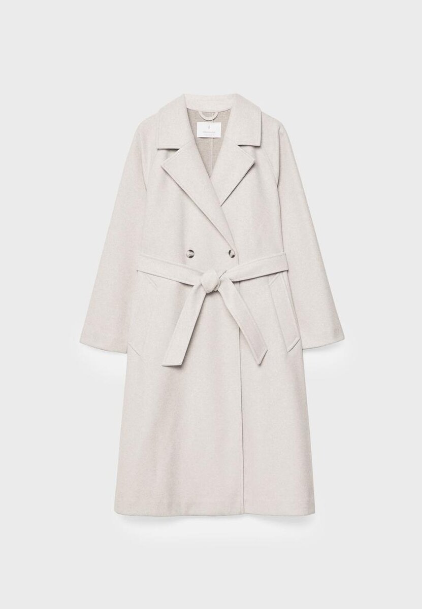 Manteau long au toucher doux, avec col à revers et manches longues. Poches latérales. Façon croisée avec boutons contrastés et ceinture colorée. Disponible en plusieurs couleurs.