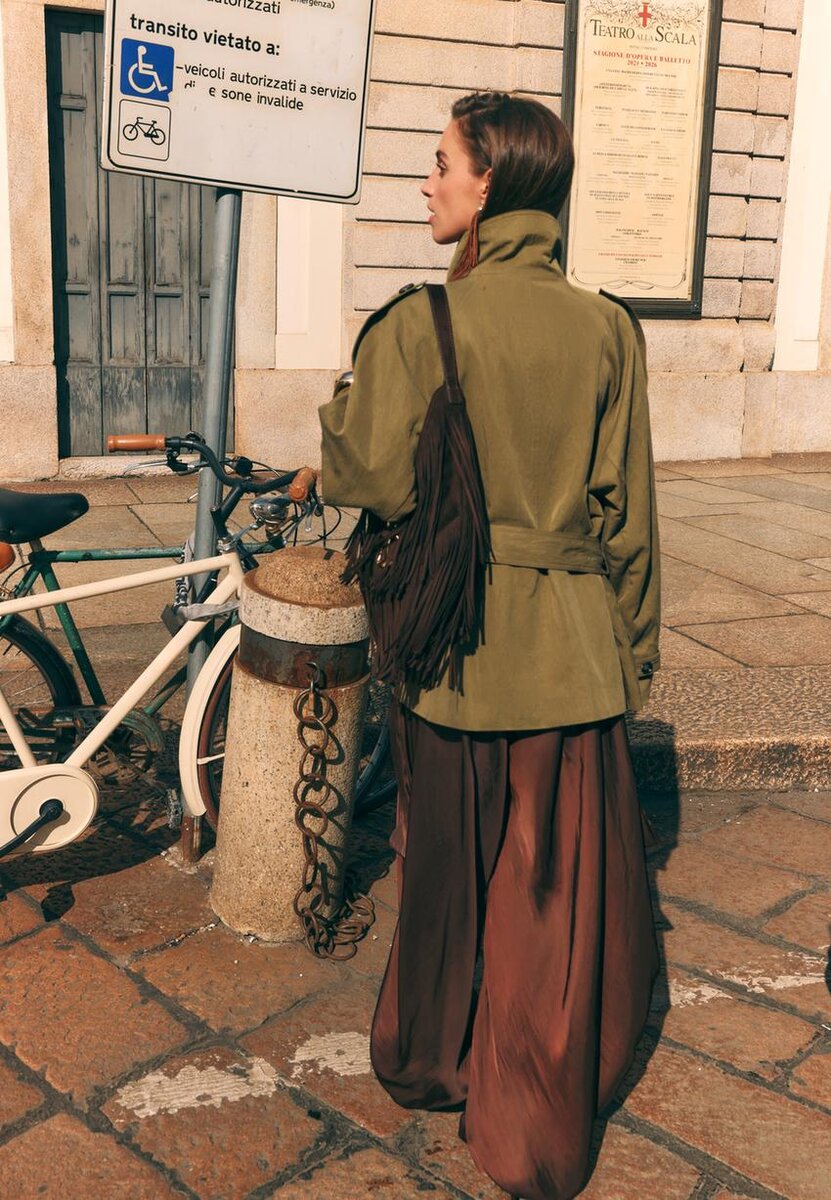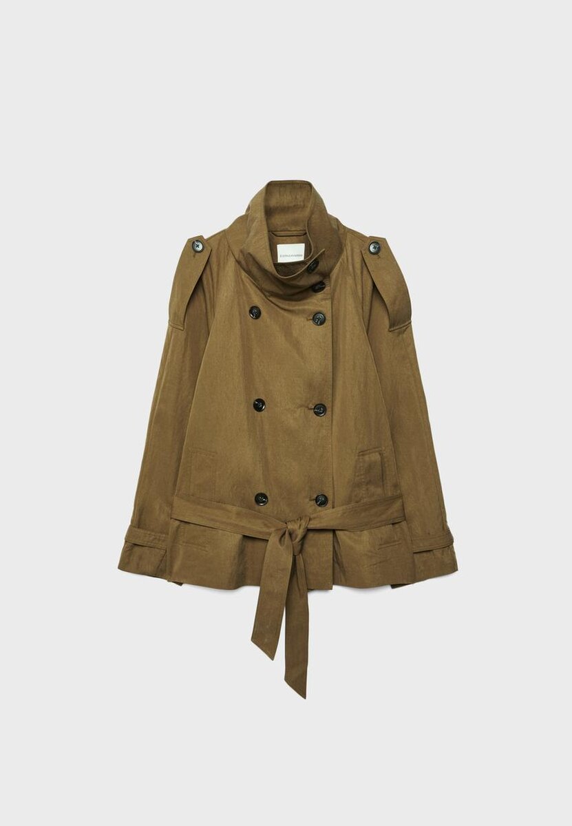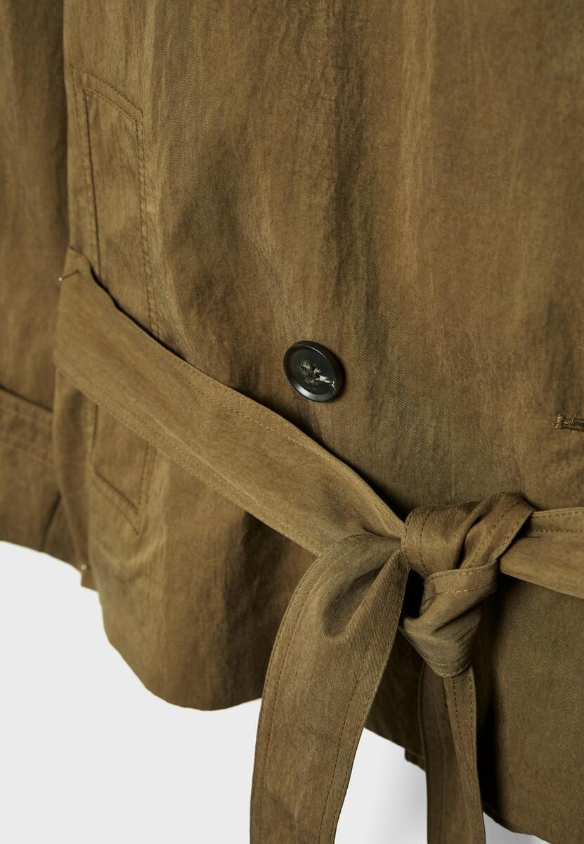 Manteau court fluide avec col à revers et manches longues dotées d’une patte et d’un bouton. Poches latérales. Fermeture à double boutonnage sur le devant et ceinture à nouer.