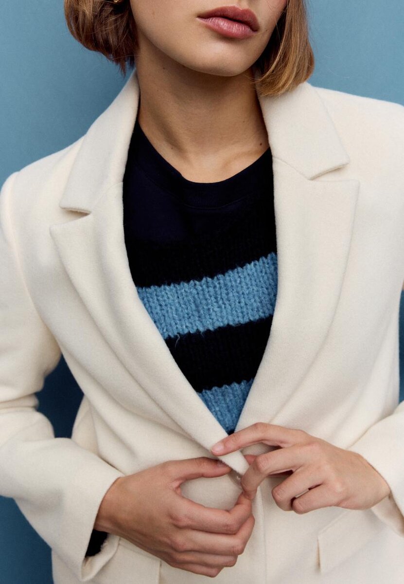 Manteau long de style masculin. Col à revers et manches longues. Poches passepoilées sur le devant. Fermeture à boutons sur le devant.