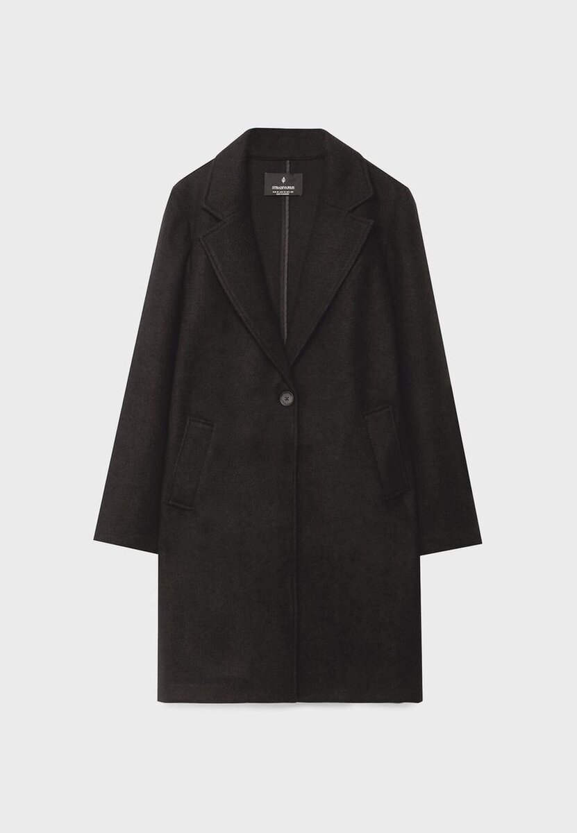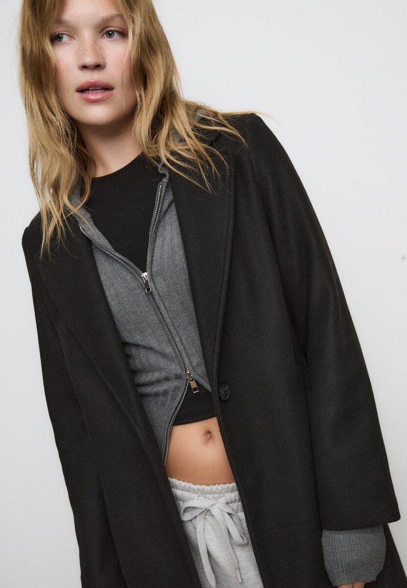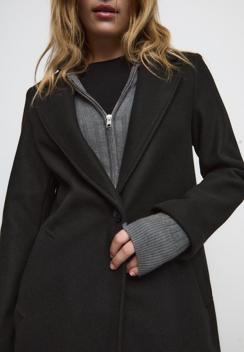 Manteau mi-long en maille à col, manches longues et fermeture à boutons colorés sur le devant. Disponible dans une gamme de couleurs.
