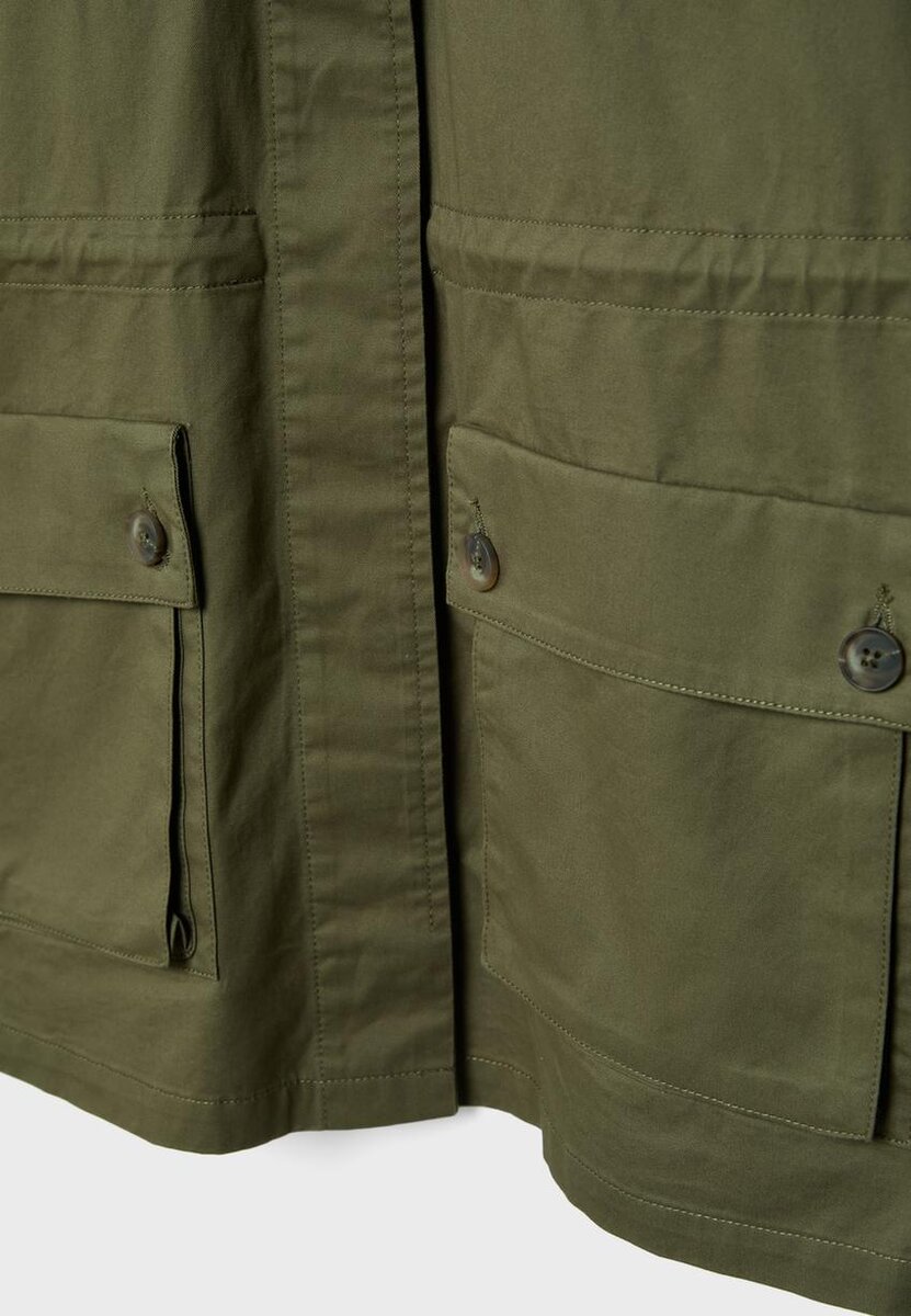 Parka en coton à coupe classique avec col à revers et manches longues à poignets boutonnés. Poches plaquées sur le devant avec rabats et boutons. Cordon de serrage réglable à la taille avec stoppeurs à l’intérieur. Fermeture à glissière sur le devant dissimulée par une patte à boutons-pression. Disponible en plusieurs couleurs.
