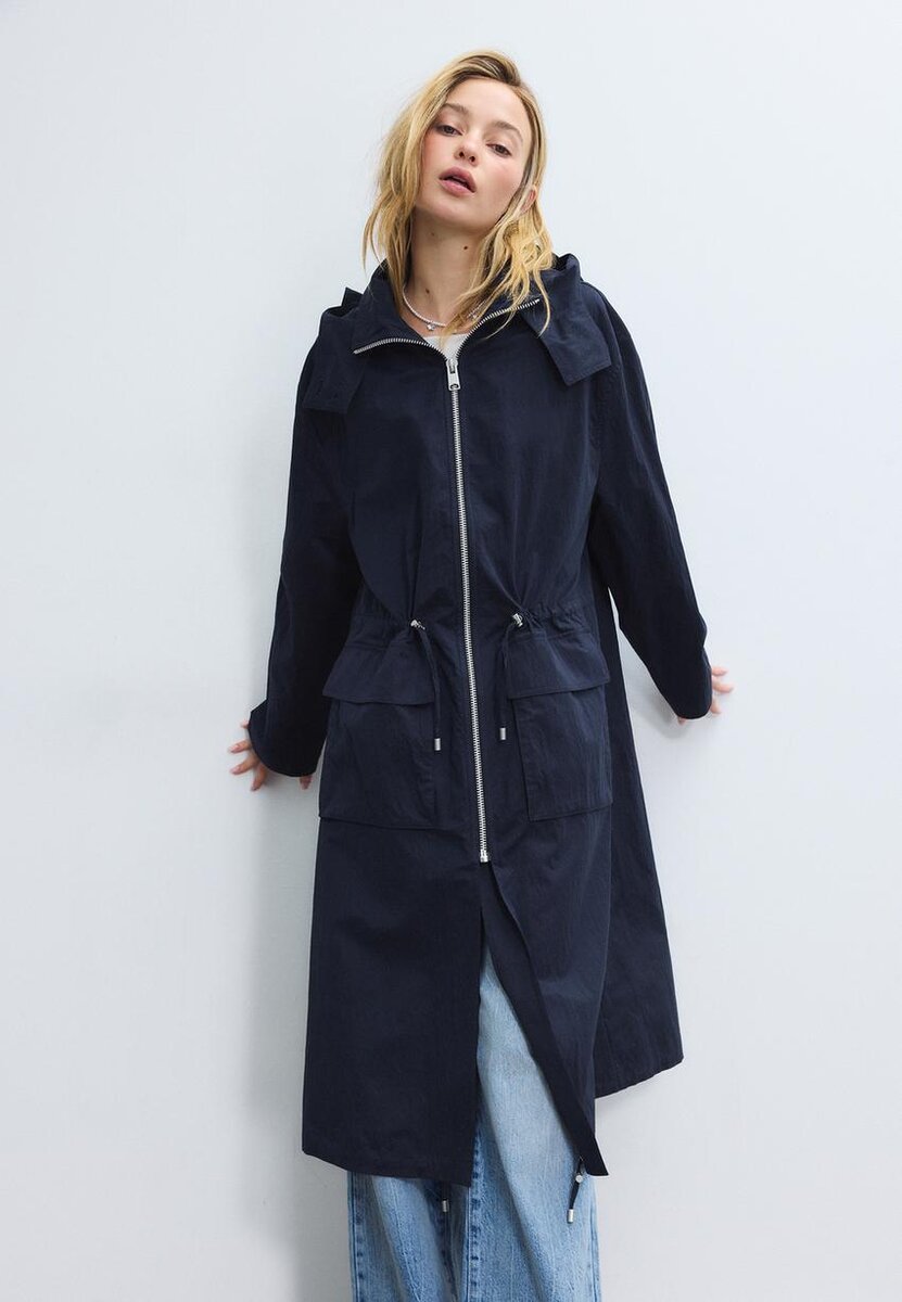 Veste de style parka à col montant, capuche boutonnée et manches longues. Poches plaquées à rabat sur le devant. Fermeture à glissière métallique sur le devant. Ourlet et taille ajustables à l’aide d’un cordon de serrage ton sur ton.
