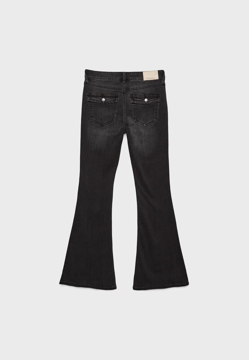 Jean flared taille basse avec passants de ceinture sur la ceinture. Poches plaquées à l’avant et à l’arrière ornées de rabats boutonnés. Bas flared, braguette à fermeture éclair à l’avant et fermeture par bouton métallique.