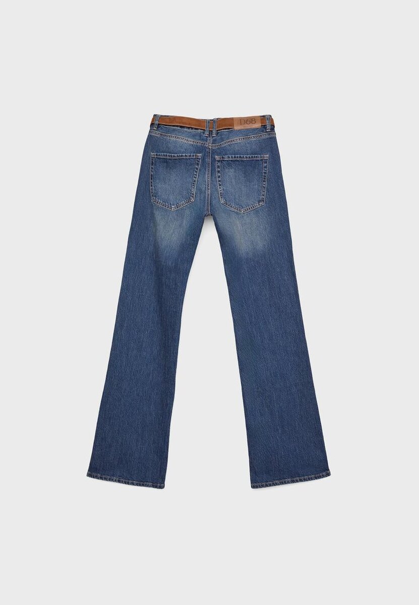 Jean taille moyenne avec passants de ceinture. Doté de poches avant, de poches arrière plaquées et d’une ceinture amovible assortie avec boucle métallique. Ajusté jusqu’aux genoux avec un léger évasement à l’ourlet. Disponible en plusieurs couleurs.