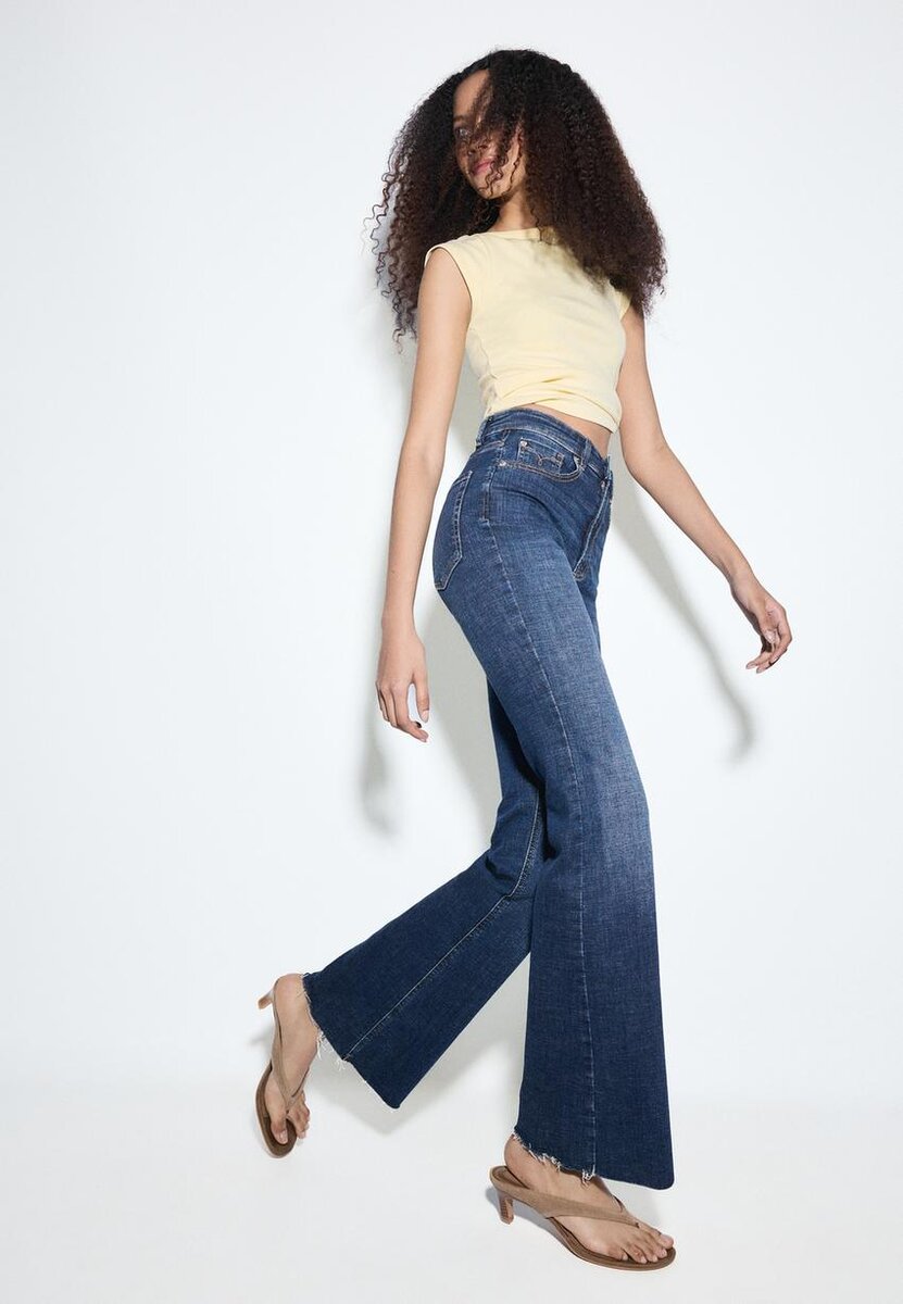 Jean taille haute à cinq poches avec passants de ceinture. Ourlets évasés avec finitions effilochées et fente intérieure sur le côté. Braguette à fermeture éclair et bouton métallique sur le haut. Disponible en plusieurs couleurs.