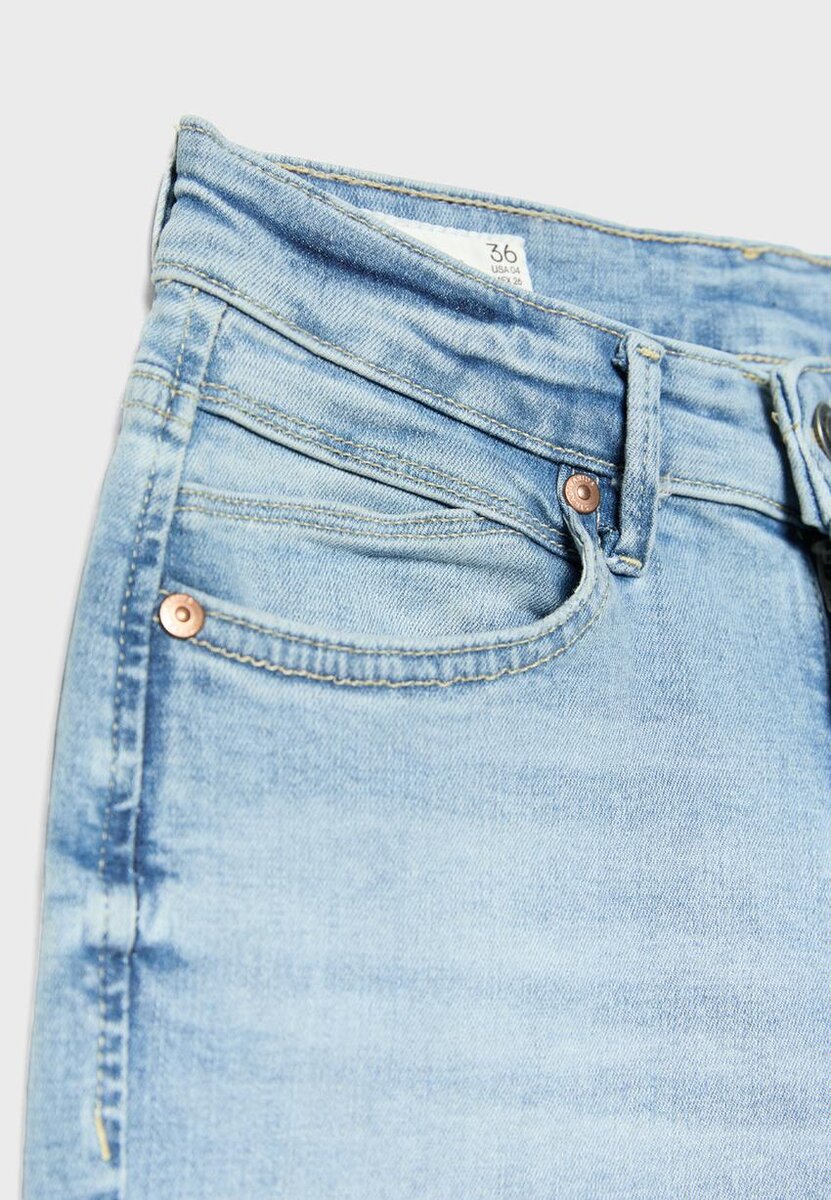 Jean taille haute à cinq poches. Doté de passants de ceinture, d’un ourlet évasé, de détails effilochés et d’une fente intérieure sur le côté. Braguette zippée et fermeture par bouton métallique. Disponible en plusieurs couleurs.
