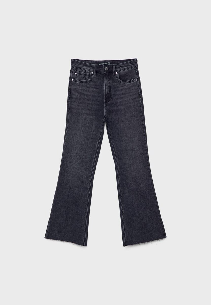 Flared jean court à taille haute et ourlets Seamless. Doté d’une coupe à cinq poches, d’une braguette zippée et d’une fermeture par bouton métallique.
