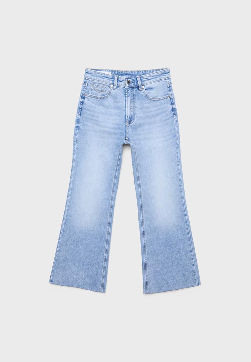 Flared short jean with belt loops. Featuring front pockets, back patch pockets, a short leg design, frayed hems, and a zipper and metal buttons at the front. Disponible en plusieurs couleurs.