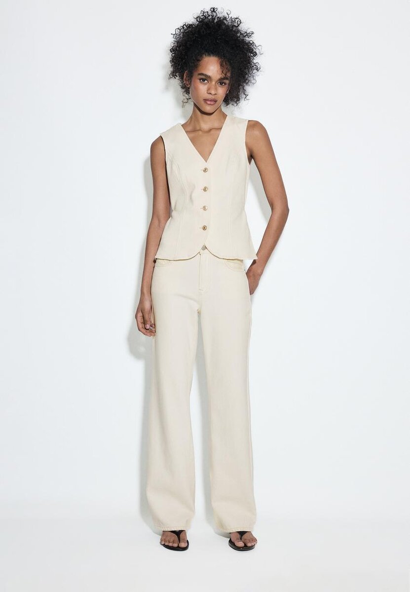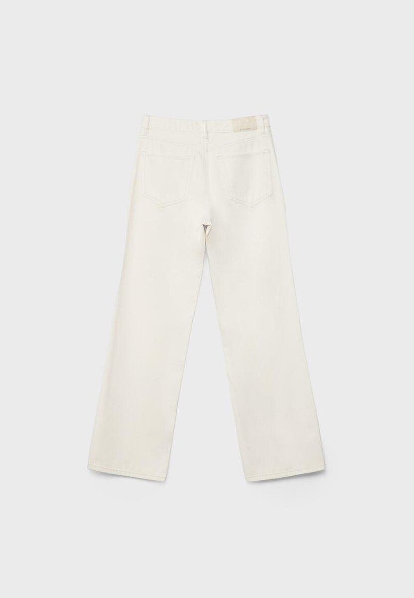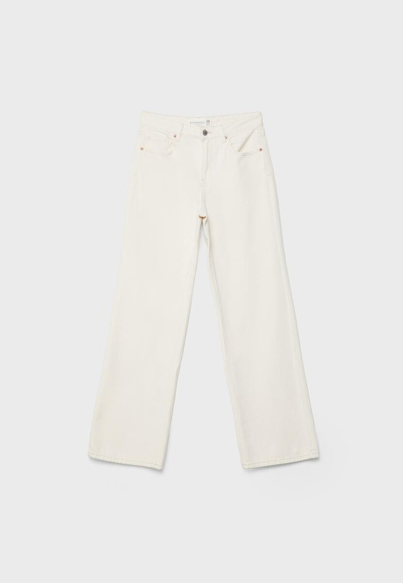 Jean droit à taille haute et jambes larges avec poches avant. Poches plaquées à l’arrière. Ceinture avec passants. Coupe droite, Wide Leg. Fermeture à glissière à l’avant et boutons métalliques. Disponible en plusieurs couleurs.