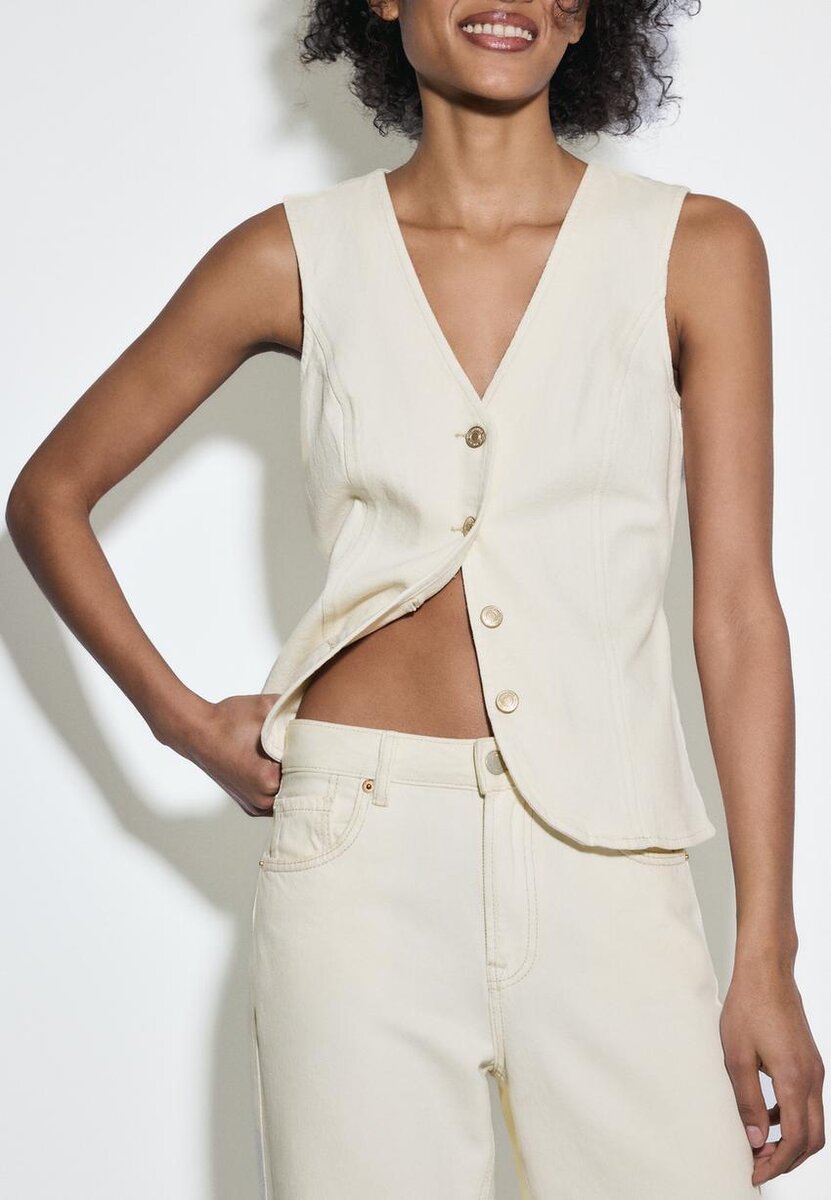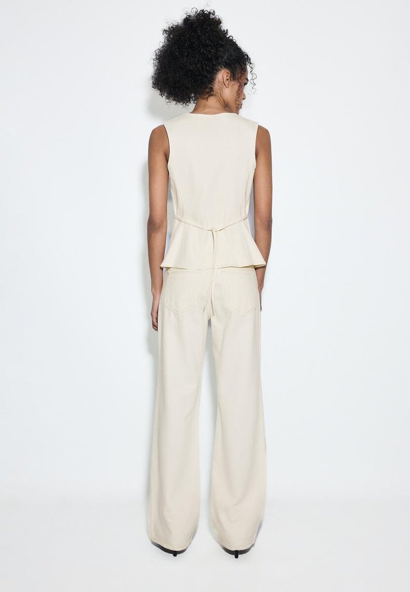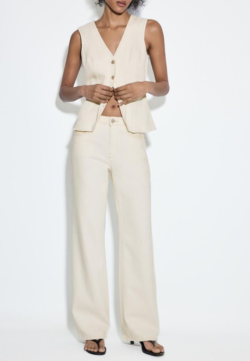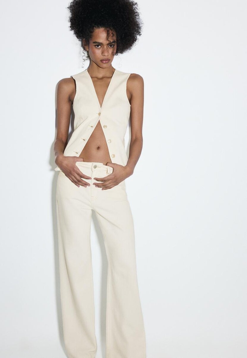 Jean droit à taille haute et jambes larges avec poches avant. Poches plaquées à l’arrière. Ceinture avec passants. Coupe droite, Wide Leg. Fermeture à glissière à l’avant et boutons métalliques. Disponible en plusieurs couleurs.