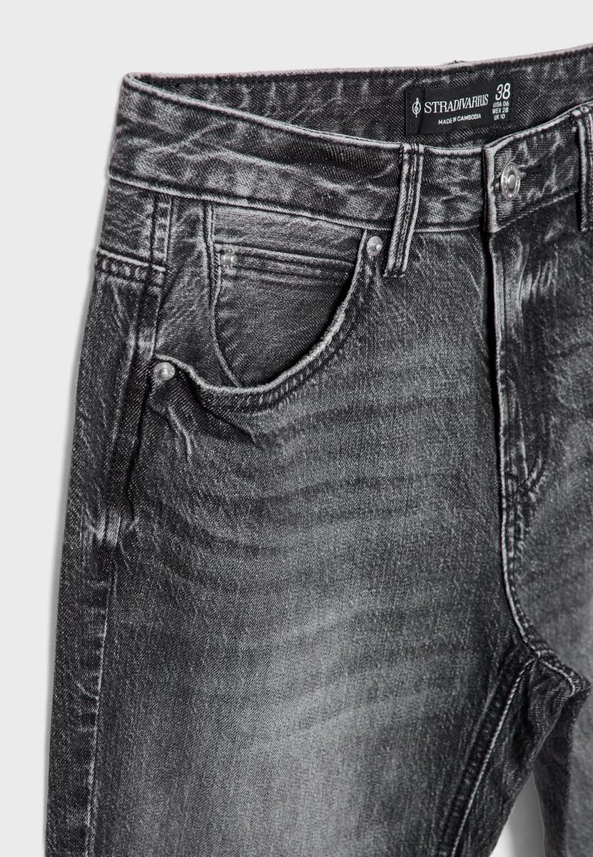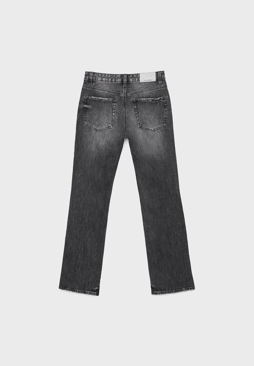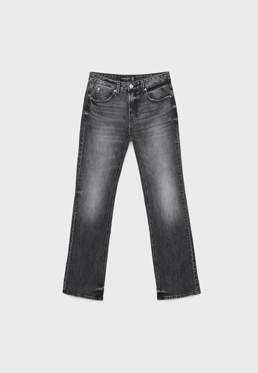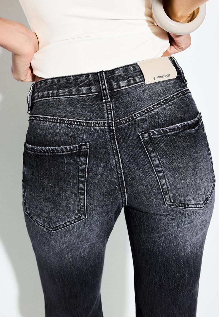 Jean à coupe droite et taille mi-haute, modèle à cinq poches. Fermeture à glissière et bouton métallique. Disponible en plusieurs couleurs. Taille : Taille normale jusqu’au nombril