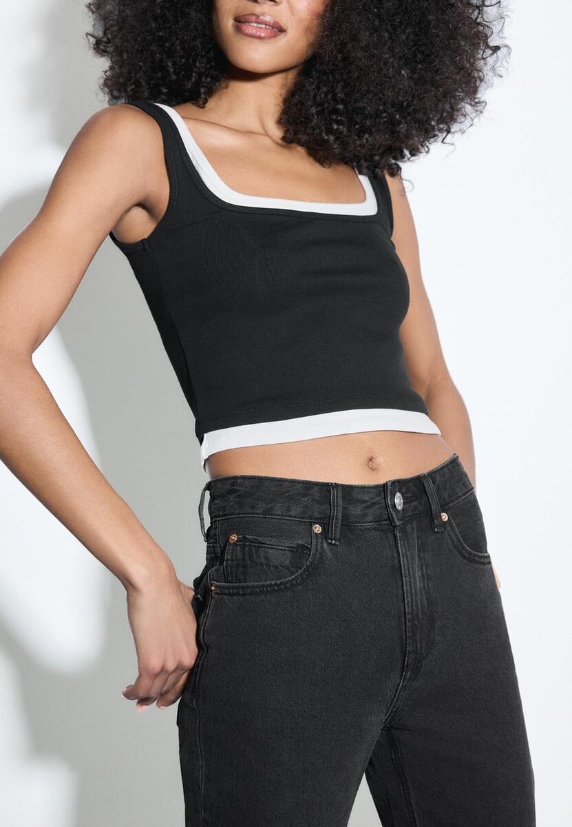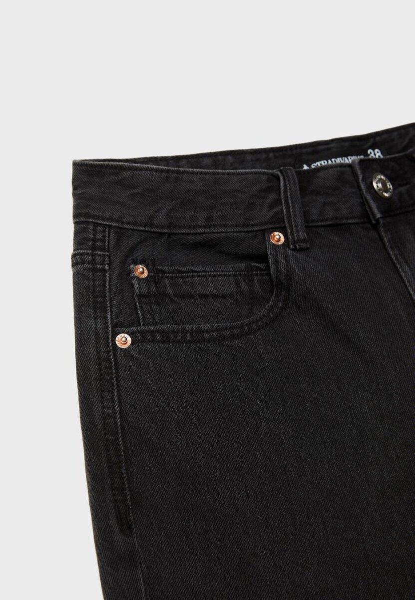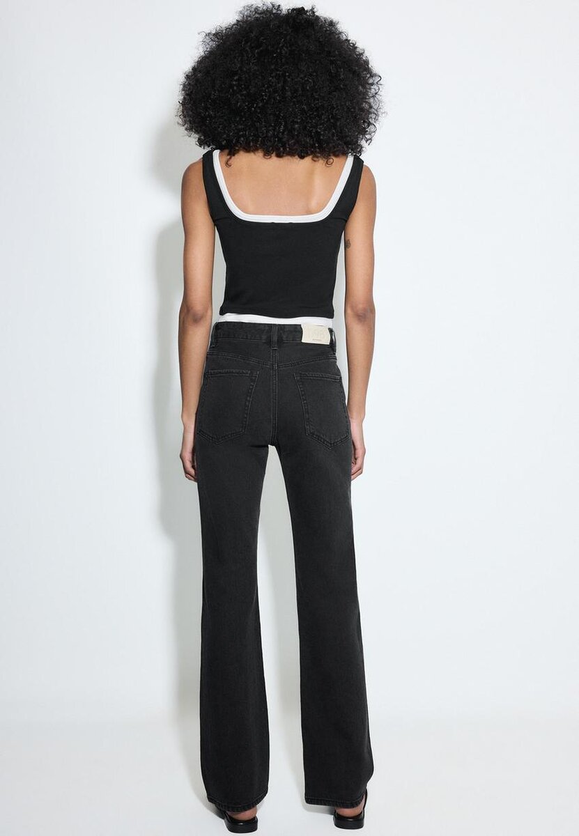 Jean à coupe droite et taille mi-haute avec cinq poches. Fermeture à glissière et bouton métallique. Disponible en plusieurs couleurs.