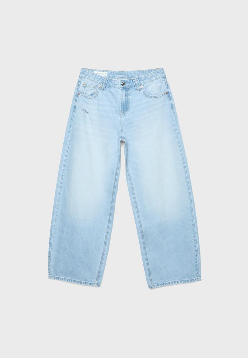 Jean taille haute coupe Barrel avec passants de ceinture et cinq poches. Fermeture à glissière et boutons à l’avant. Disponible en plusieurs couleurs.