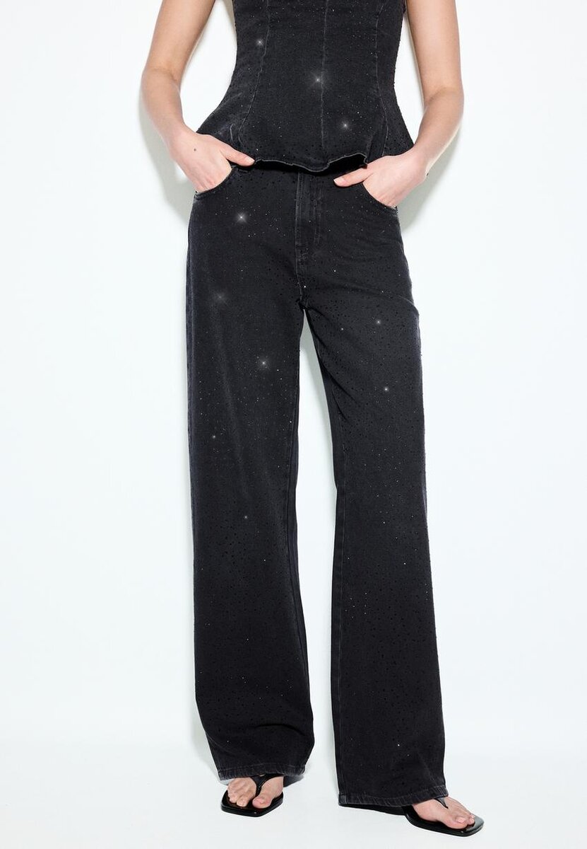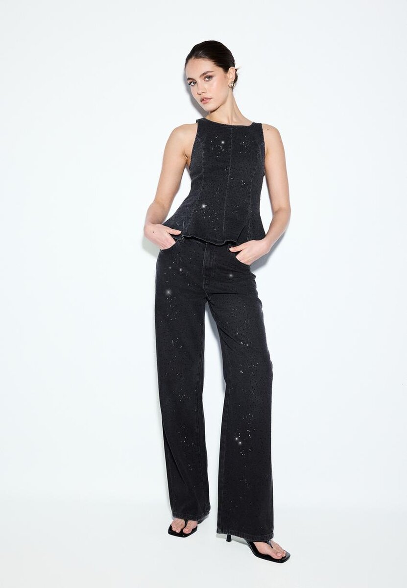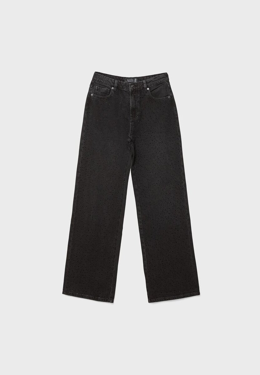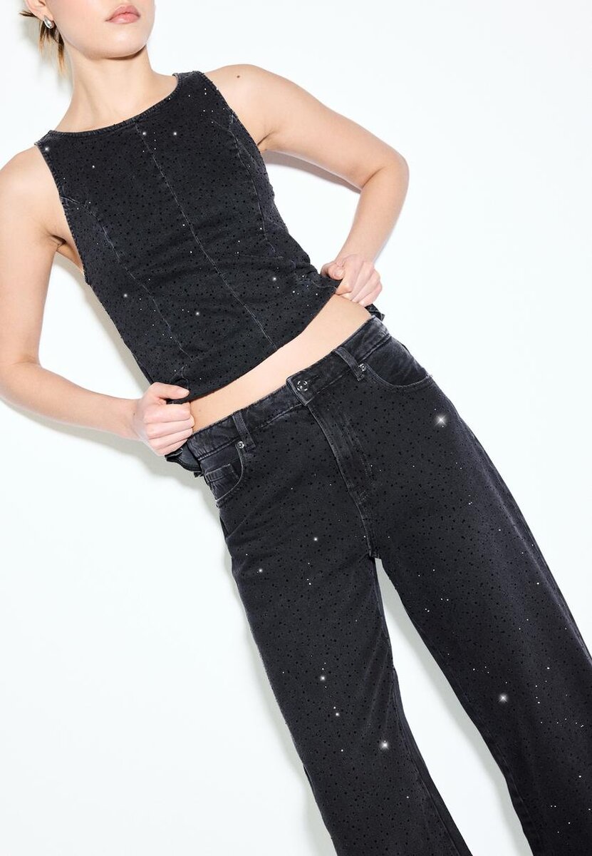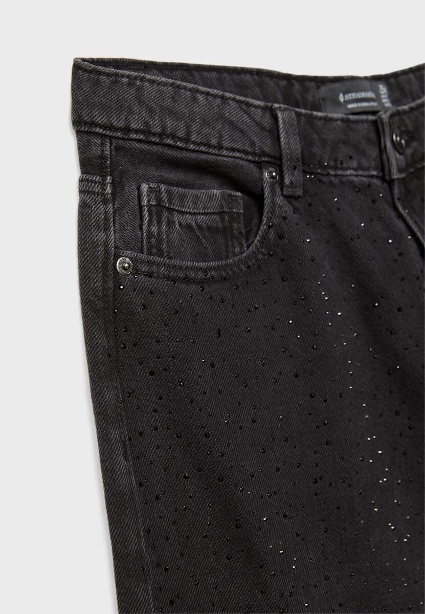 Jean taille mi-haute avec poches avant. Poches plaquées à l’arrière. Détails en strass sur le devant. Coupe droite. Braguette à fermeture éclair et bouton métallique à l’avant.
