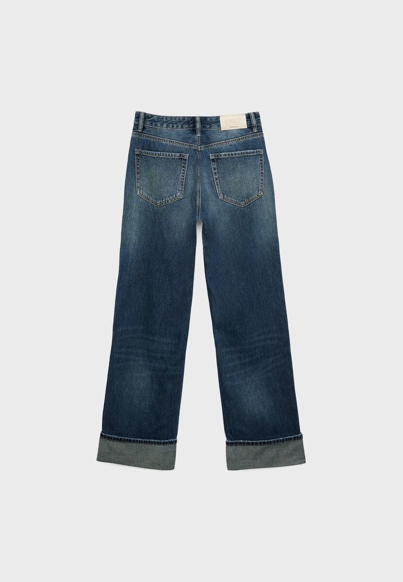 Jean droit à taille haute et coupe ample, modèle à cinq poches. Braguette à fermeture éclair et bouton métallique sur le haut.
