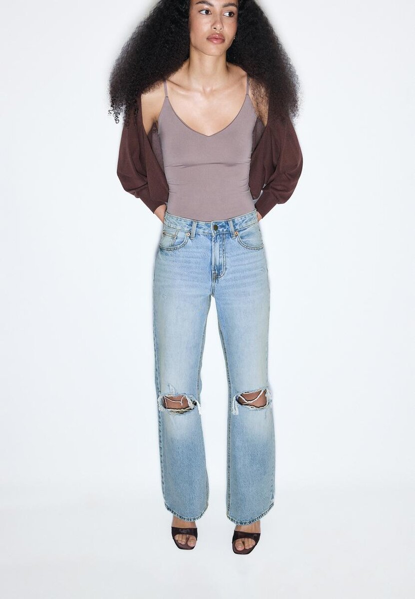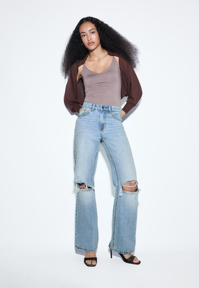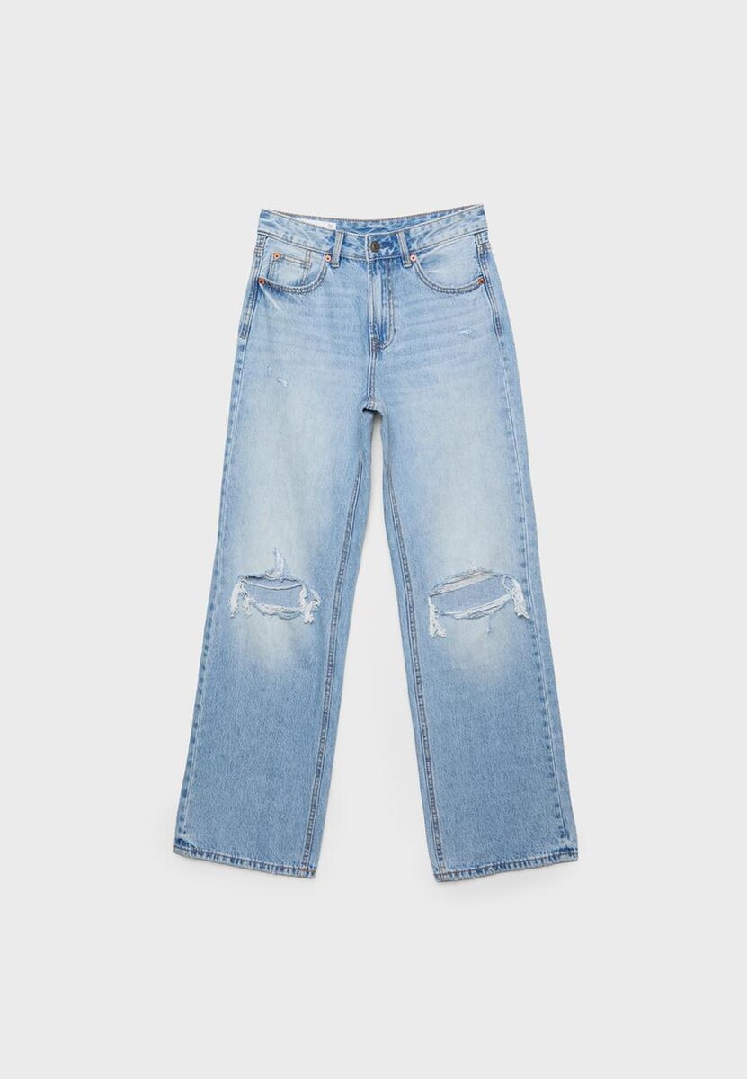 Jean droit à taille haute et coupe Wide Leg, avec cinq poches. Braguette zippée et fermeture par bouton métallique.