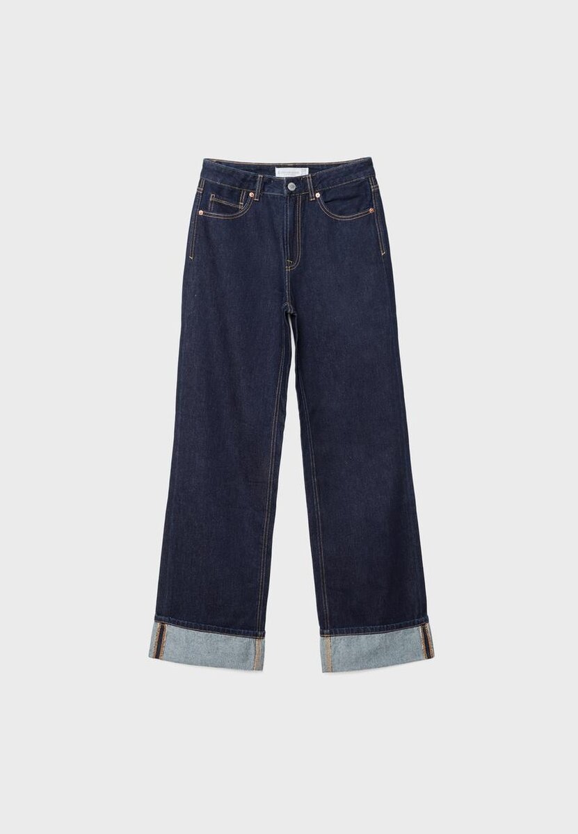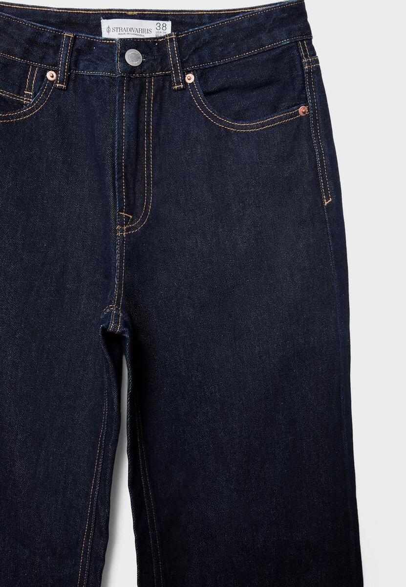 Jean droit à taille haute et coupe large avec cinq poches. Braguette zippée et fermeture par bouton métallique.